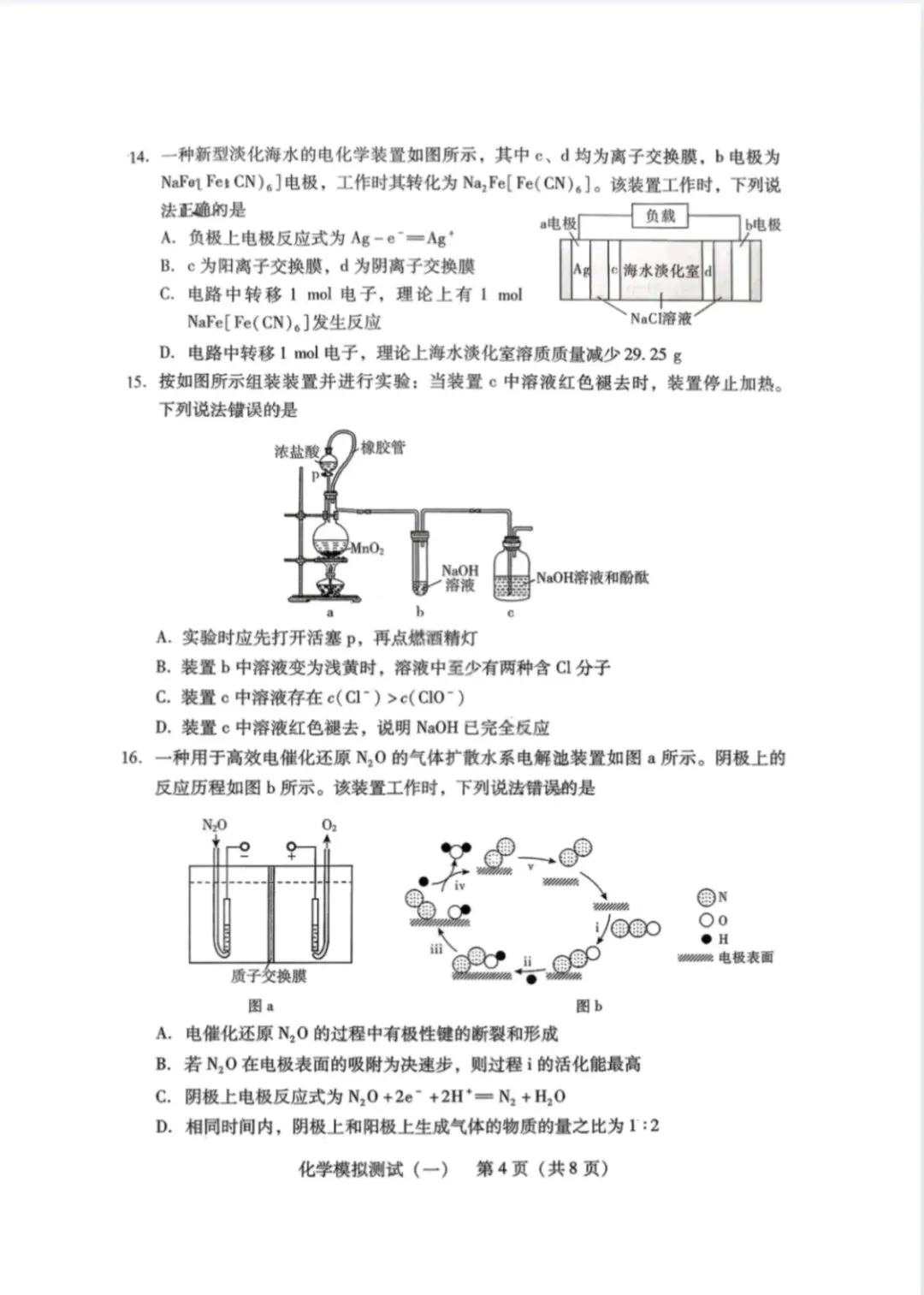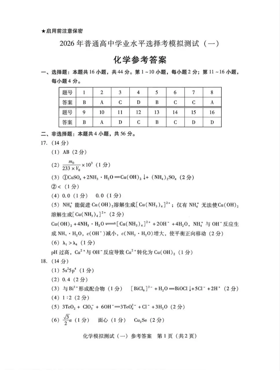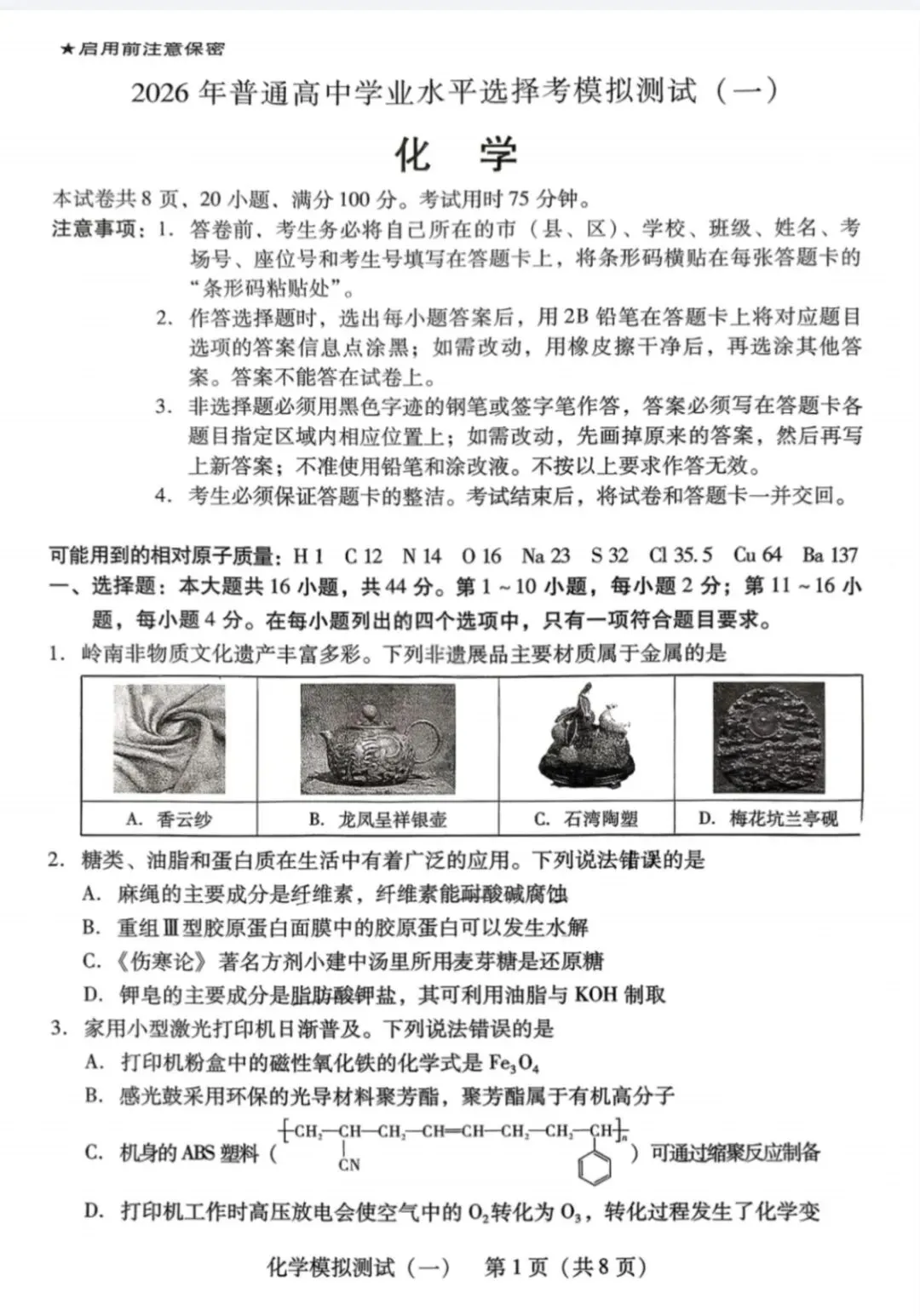 >2026年3月广东高三一模化学试卷和参考答案