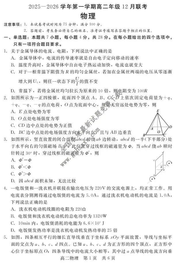 >《高中试卷》河北省石家庄市等两地2025-2026学年高二上学期12月联考物理试卷(含答案)