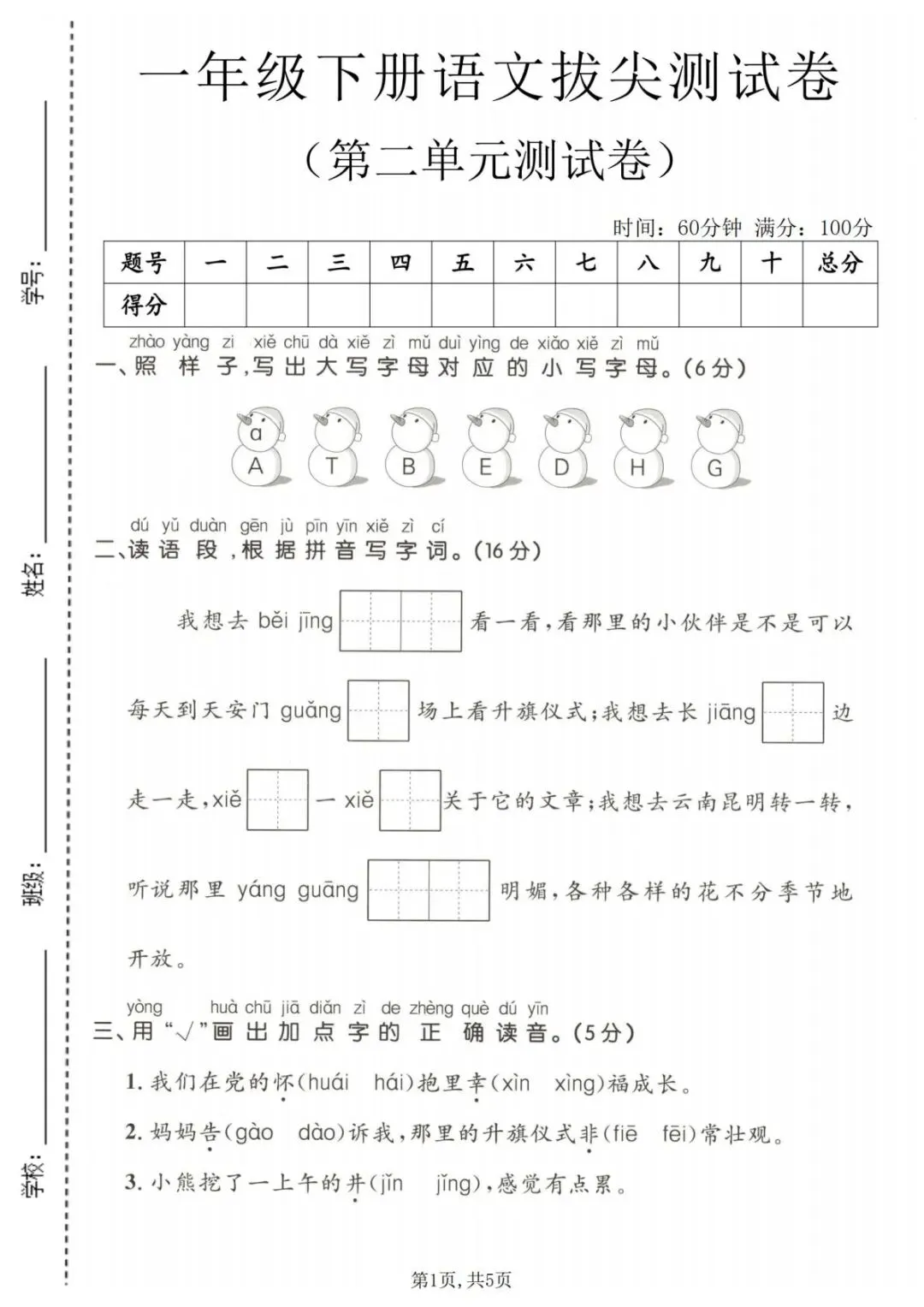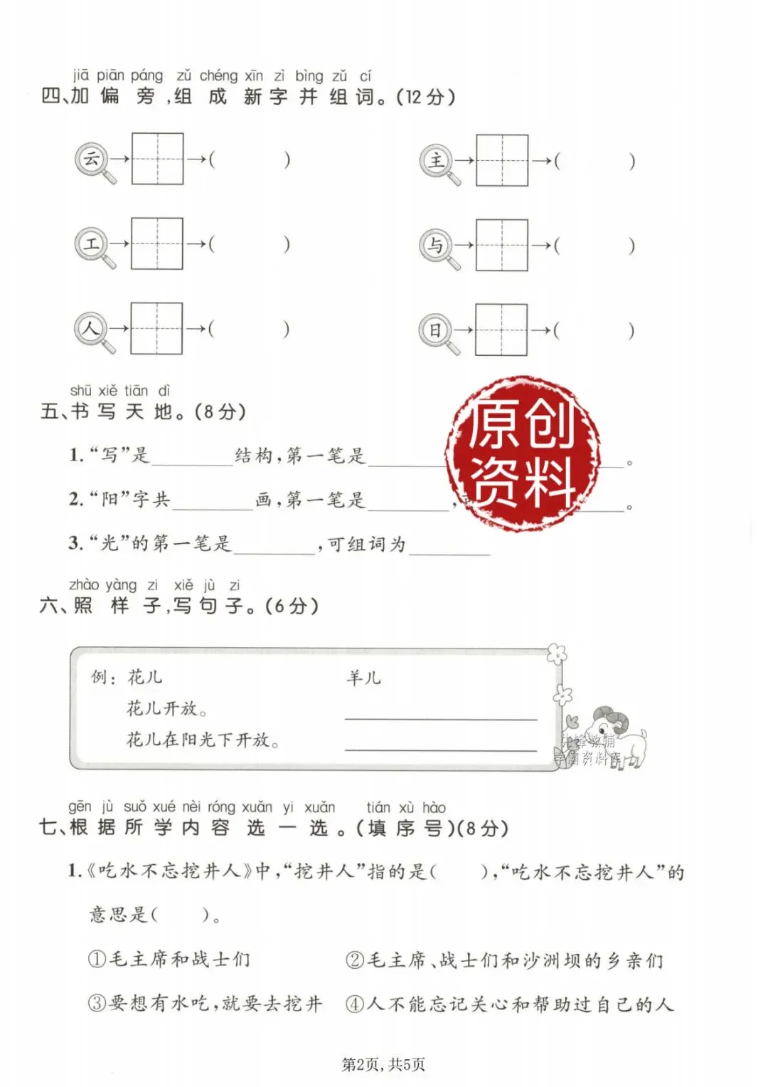 一年级下册语文第二单元测试卷《原创试卷》