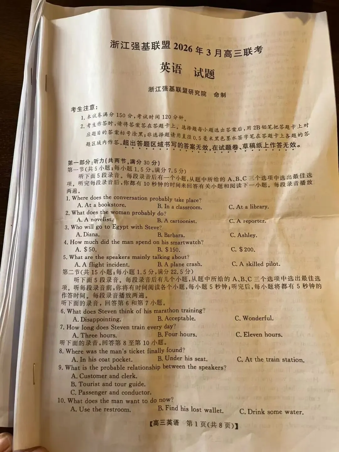 本周分享高三英语试卷:2026广州一模英语试卷 VS 2026浙江强基联盟3月英语