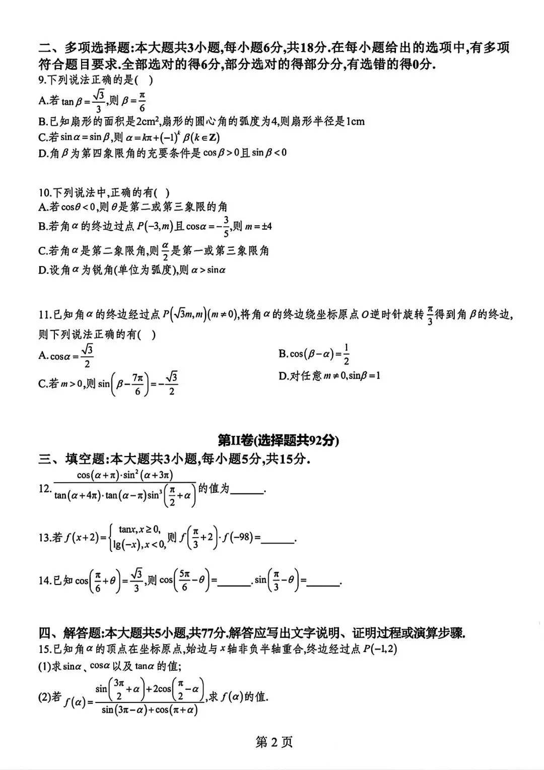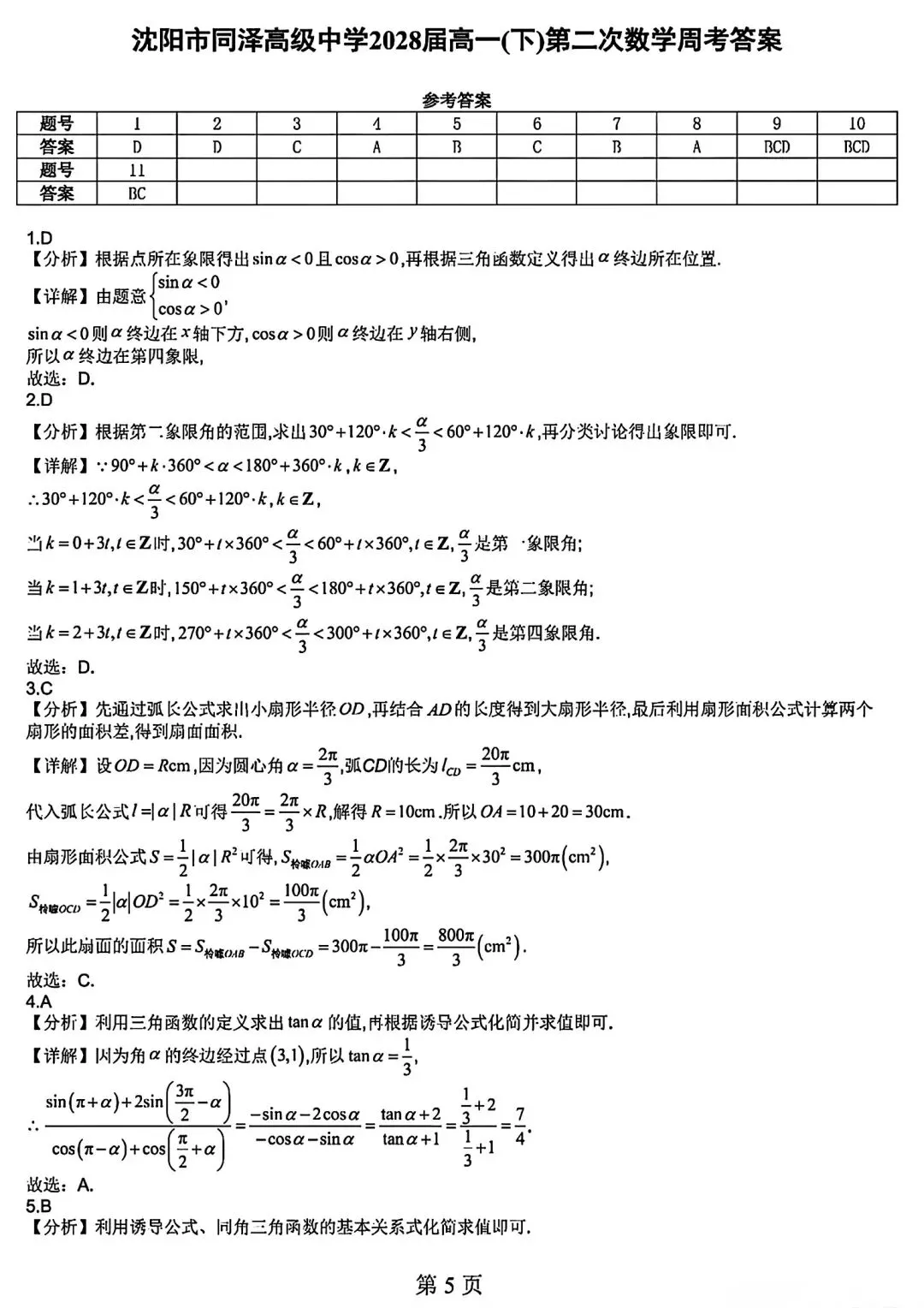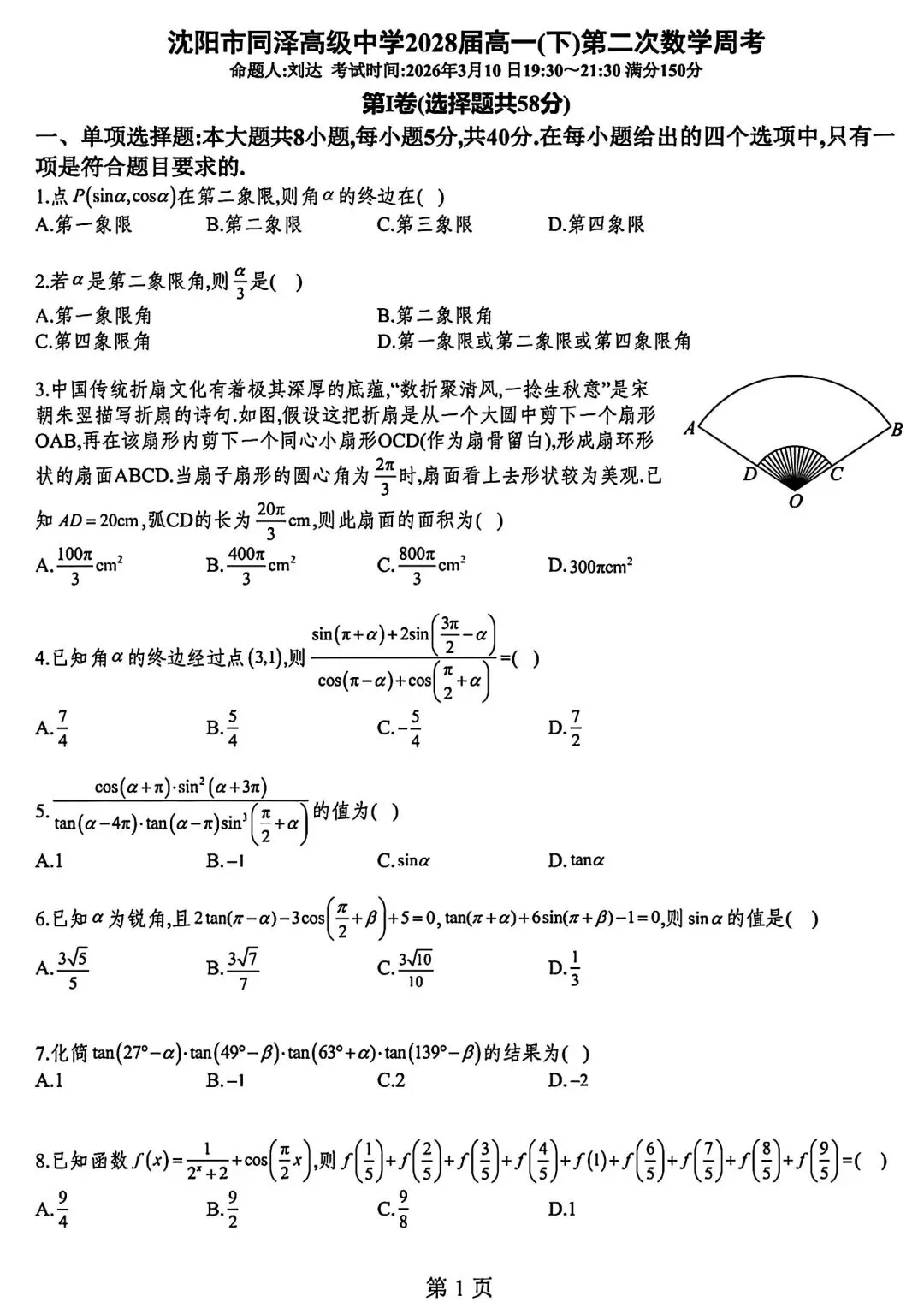 2025-2026沈阳同泽高一下第二次周考数学含答案(无水印).pdf