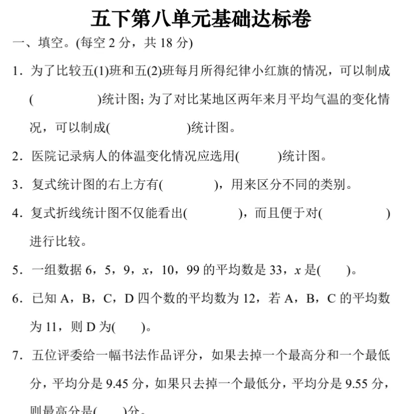 本文分享:小学五年级下册数学各单元测试题(免费下载可打印)