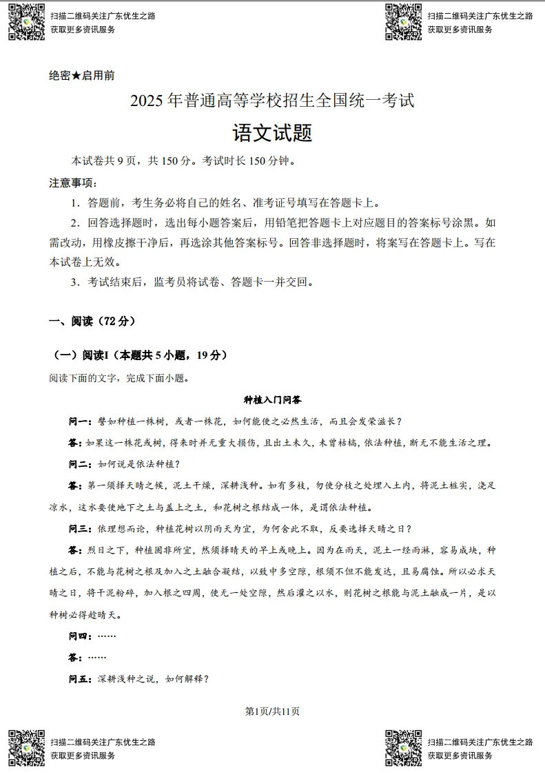 新高考Ⅰ卷语文试卷预览