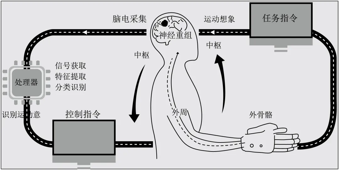 该脑机接口系统通过采集用户运动想象产生的脑电信号,经特征提取与分类识别解析其运动意图,再由处理器生成控制指令,最终驱动外骨骼执行相应动作。