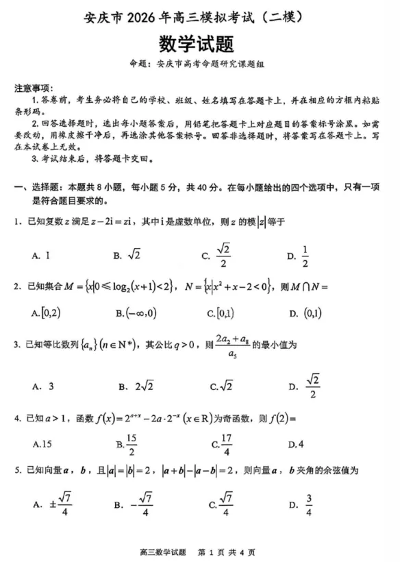 -安庆市2026年高三模拟考试(二模)