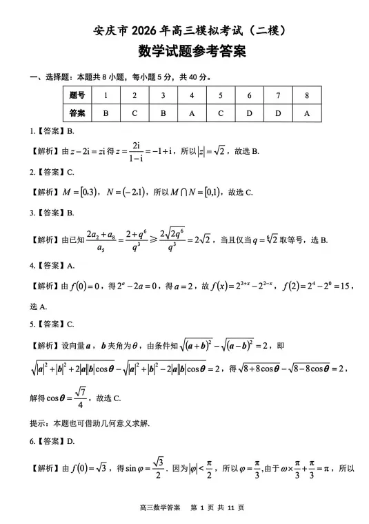 数学答案-安庆市2026年高三模拟考试(二模).pdf