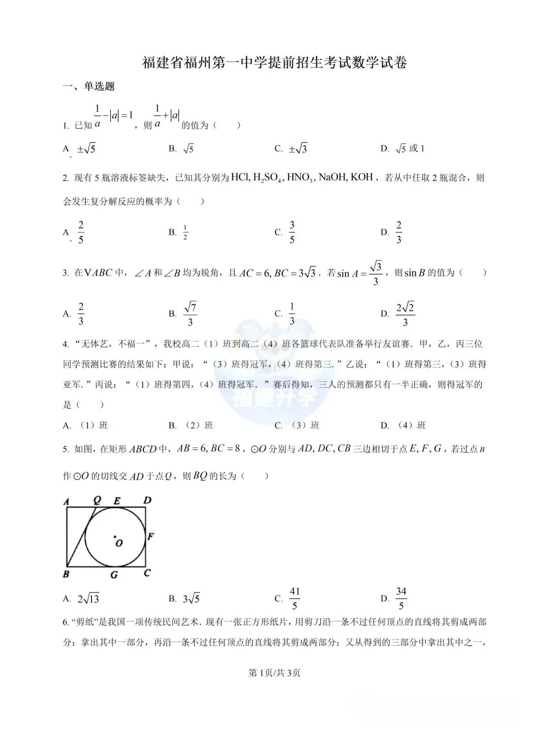 福建省福州第一中学2025年提前招生考试数学试卷及答案解析