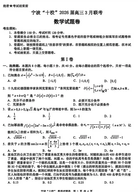 宁波十校2026届高三3月联考