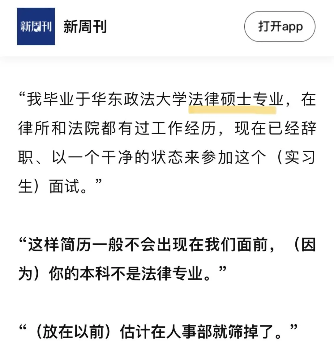社会认可度这一点不是可以随意忽视的。看上去只是有的岗位不要法硕而已,此处不留爷自有留爷处。但好地方的法院、检察院不要法硕意味着什么呢?这其实是一个风向标,内行人觉得法硕不如学硕,就可能传导到社会,影响其他人的想法。最终可能造成整个社会的法硕认可度低于学硕。
