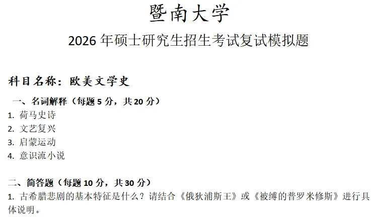 当前位置:首页>考研真题>暨南大学欧美文学史考研复试真题模拟