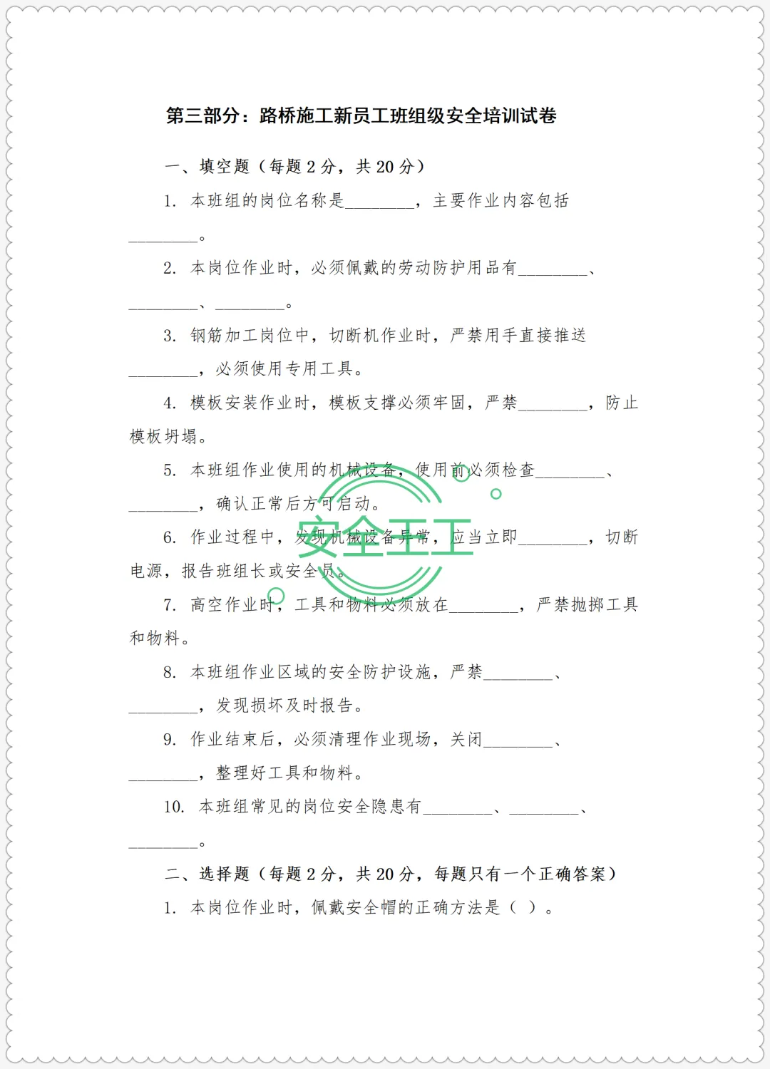 >路桥施工新员工三级安全培训试卷(公司级+项目级+班组级)及答案