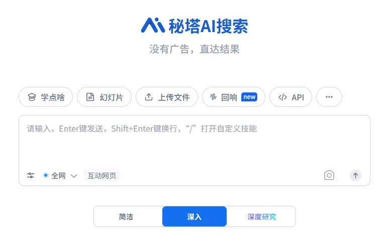 打开秘塔AI官网(metaso.cn),在首页输入框上方,你会发现一个醒目的入口: