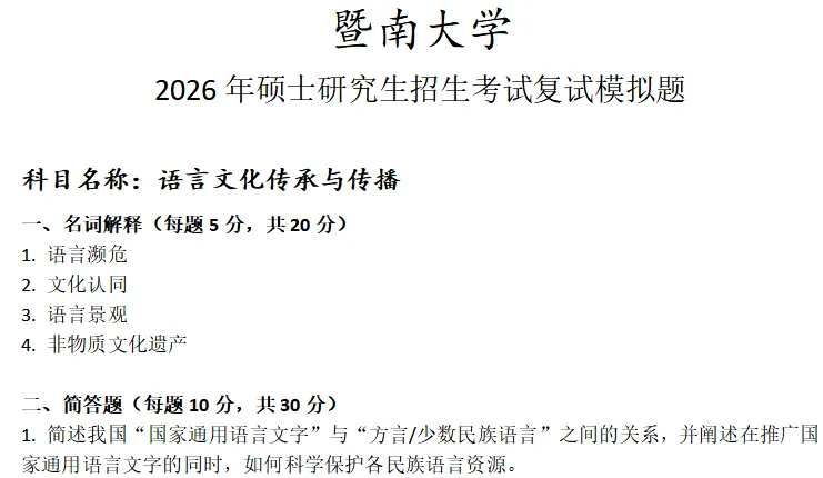 当前位置:首页>考研真题>暨南大学语言文化传承与传播考研复试真题模拟
