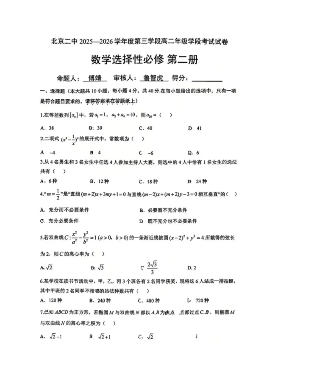 2026北京二中 高二阶段考 数学试卷+答案