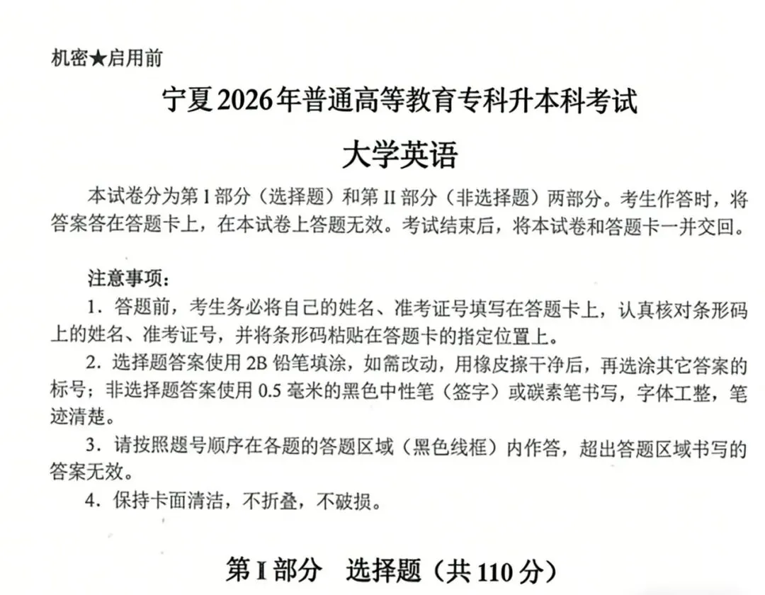 2026年宁夏专升本考试(大学英语)考试结束了!