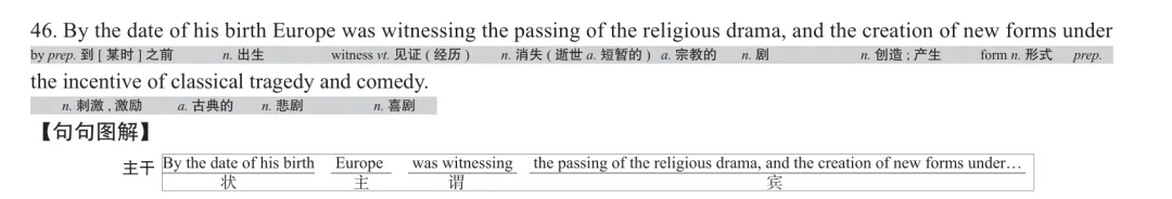 【句句解说】本句照结构的字面意思是,“到他出生的那个日期之前,欧洲正见证着宗教戏剧的消逝,以及[在古典悲剧和喜剧的激励下的]新形式的创造”。翻译时注意以下几点:第一,句中的by应该取“到(某时)之前;不迟于”这条义项,但是翻译时很少译作“到(某时)之前”。例如:By the age of fourteen he had already determined to go to sea.他14岁时就已下决心要当水手了。By 1974 the factory coped for repairs for 700 trucks per year.截止1974年该厂已能年修卡车700辆。第二,从前一句可知,本句中的his birth指的是莎士比亚出生,孤立句子,按理此处应该译为实称(说明你看了上文的),本题没有做要求显然是命题人的善举。第三,new forms(新形式)译成“新型戏剧形式”,采用的是“增益法”,添加了“戏剧”二字,值得注意。第四,incentive(《研读分册》Text 62)译为“激励”“激发”等也是可以的。第五,classical tragedy and comedy 不宜简称为“悲喜剧”,因为悲喜剧(tragi-comedy)是一个特定的戏剧体裁,结合了悲剧与喜剧的成分,而悲剧和喜剧则是两个单独的戏剧种类,即古希腊和古罗马时期的悲剧和喜剧。 本题得分率为38.9%,即人均0.778分。