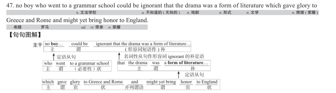 【句句解说】根据参考译文倒推,本句的最大构成单位是no boy who went to a grammar school(主语)、could be ignorant(谓语)、that the drama…(宾语)这三个,实际上并不是这样的。这是一个标准的主谓补结构(或者说主系表结构),把could be ignorant当作及物词组动词充当谓语的人应该是受了汉语的影响(汉语形容词可以作谓语带宾语)。本句照结构的字面意思是,“没有一个上文法学校的男孩会不知道,戏剧是一种给希腊和罗马带来辉煌、且还可能给英格兰带来荣耀的文学形式”,或“没有一个上过文法学校的男孩会不知道戏剧是一种文学形式,这种文学形式给希腊和罗马带来了辉煌,且还可能给英格兰带来荣誉”等。其中no…ignorant的双重否定形式表达的是肯定的意义。that分句,命题组使用了“融合法”,即把前面主句压缩成汉语词组融合到定语从句中(作主语),这种译法在there be结构中尤为常见。例如:“We are a nation that must beg to stay alive,” said a foreign economist.一位外国经济学家说道:“我们这个国家不讨饭就活不下去。”which分句中的and没有译成“和”与“同”,而是译为“或”(参见全解分册Text 3-12),值得注意。(官方译文中的“就”字恐应改成“都”。“凡是”〔副〕表示在一定范围里没有例外,用在主语前边,其中的“是”字可以不说出来,而只用“凡”。例如:凡是跟他一起工作过的人,都称赞他良好的工作作风。凡是符合规定条件的,都可以报名参加。凡是帮助过我的人,我都不会忘记。) 本题得分率为47.1%。