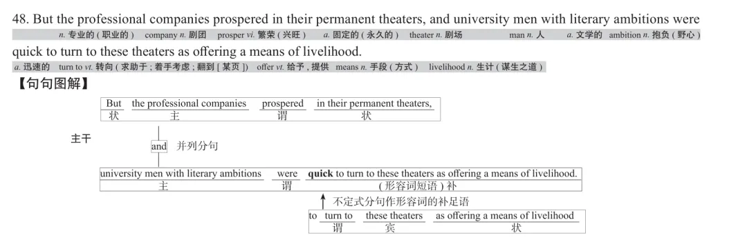【句句解说】and前面分句的参考译文是个照结构的字面意思。根据and后面分句的参考译文倒推,and后面分句的最大构成单位有五个:[大学里有文学抱负的人们]university men with literary ambitions(主语)、[迅速(地)]were quick to(状语)、[转向]turn to(谓语)、[这些剧场]these theaters(宾语)、as offering a means of livelihood(状语)。这个划分显然是错误的,且错得非常离谱。不会有“were quick to”这样的最大构成单位,不会有这样的状语。记住:凡是词都有一定的意义和自己的词性,凡是短语都有一定的意义和自己的词性,凡是分句都有一定的意义和自己的词性。句子的最大构成单位是由词、短语或分句充当的,主语、谓语、宾语、补语、状语只是最大构成单位的不同名称,因此凡是最大构成单位都有一定的意义和自己的词性。