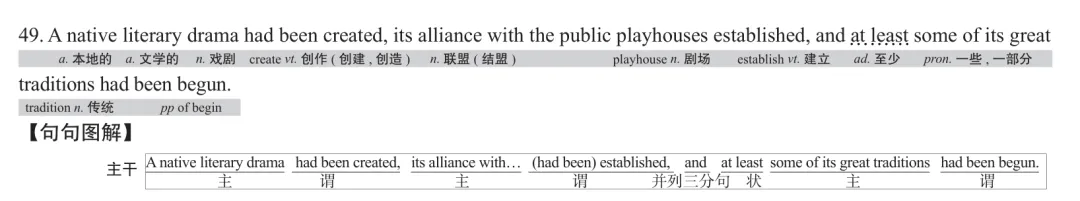 【句句解说】本句由三个并列分句构成。语态上,都是被动;时态上,都是过去完成时(表示动作已经完成)。分句2省掉了had been。句子照结构的字面意思是,“一种本土的文学戏剧已经被创造,它与公共剧场的联盟已经被建立,至少它的一些伟大传统已经被开始”。参考译文,如“已然形成”,是主动形式表示被动意义,即“已然被形成”,值得注意。(已然:一是作“已经”解,如“事情已然如此,还是想开些吧”;二是作“已经这样;已经成为事实”解,如“与其补救于已然,不如防止于未然”。)汉语是parataxis(意合),而不是hypotaxis(形合),很多时候连词可以舍弃不译(如本句中的and)。本题得分率为36.6%,即人均0.732分。
