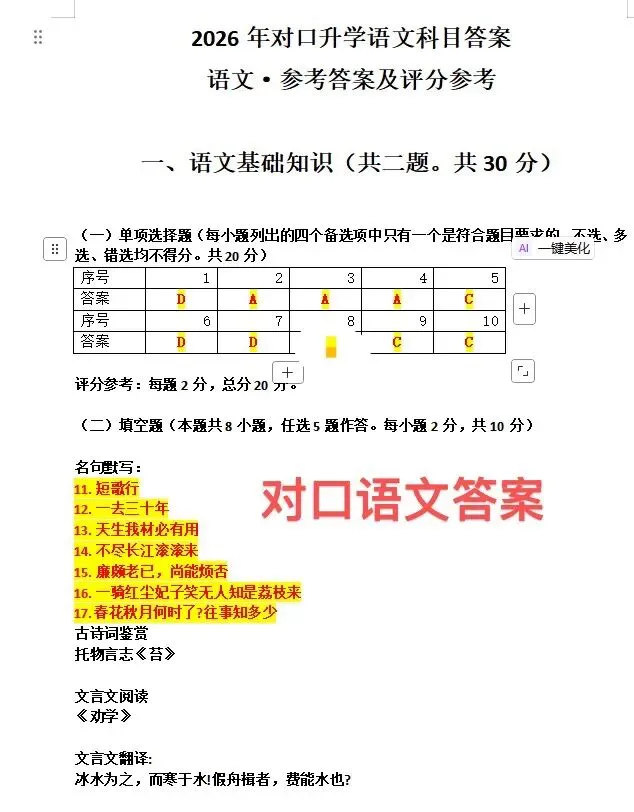 >对口语文和数学试卷答案