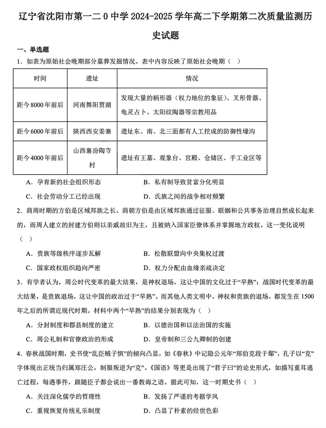 2024-2025沈阳120中学高二下4月历史含答案(无水印).pdf