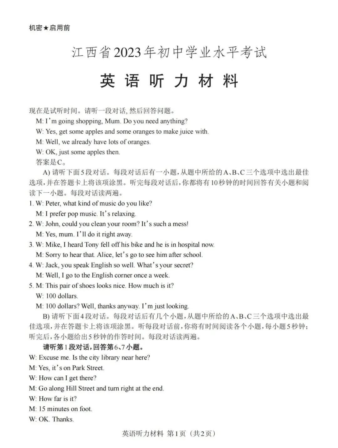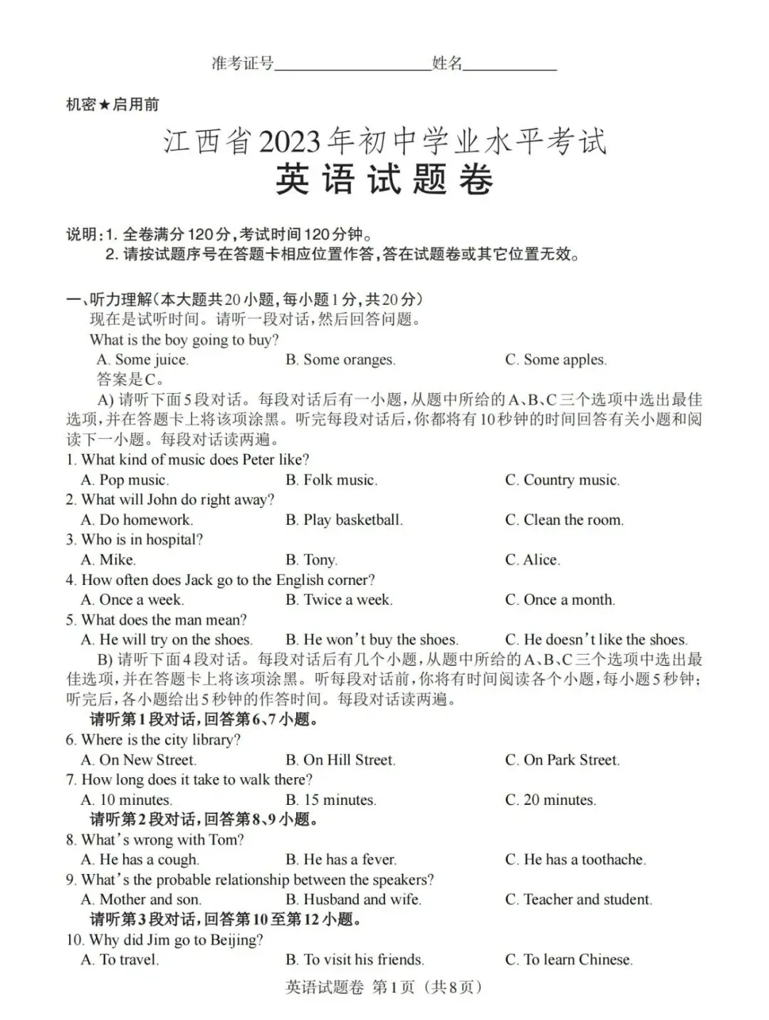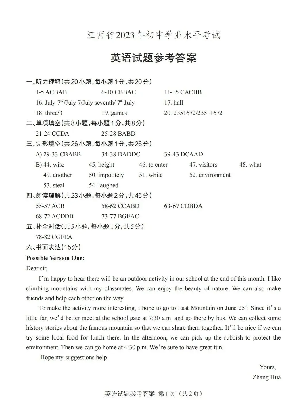 >2023年江西省初中学业水平考试英语真题卷及参考答案
