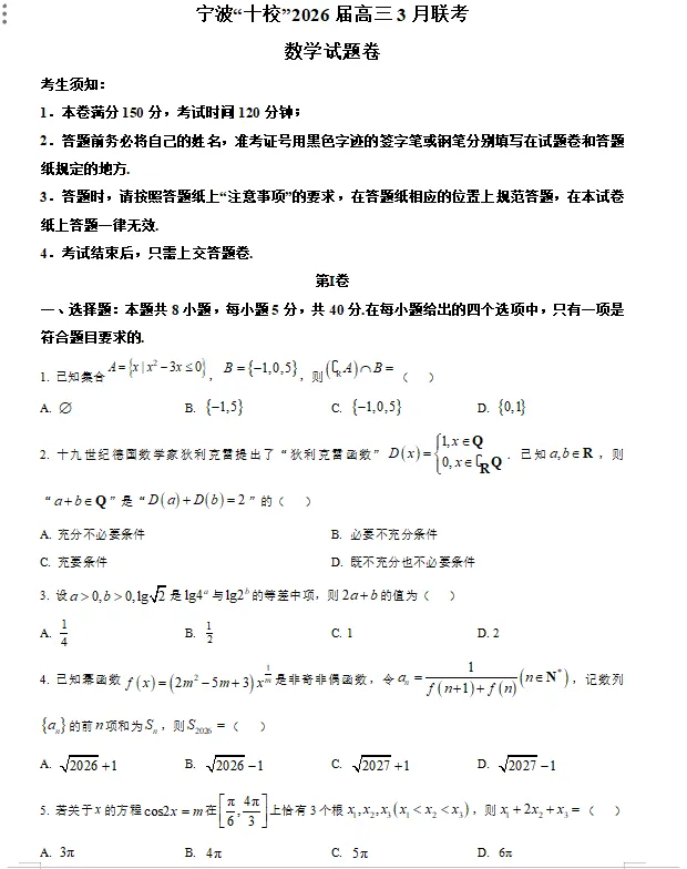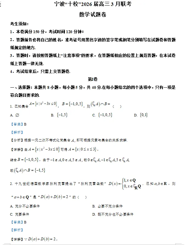 2026年3月宁波十校高三数学联考试卷及答案!
