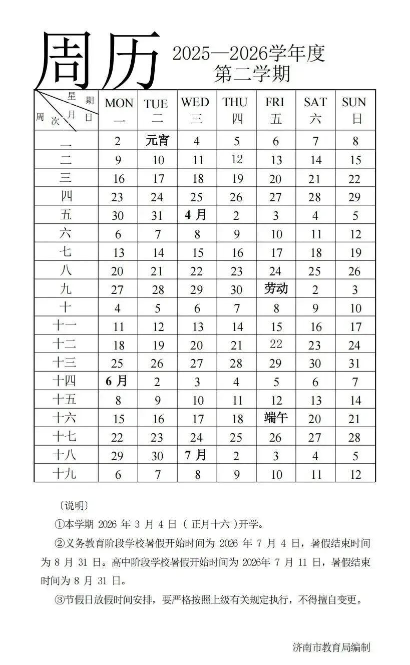 下学期,本市中小学统一于2026年3月4日(正月十六)开学。