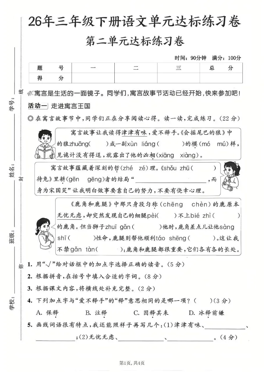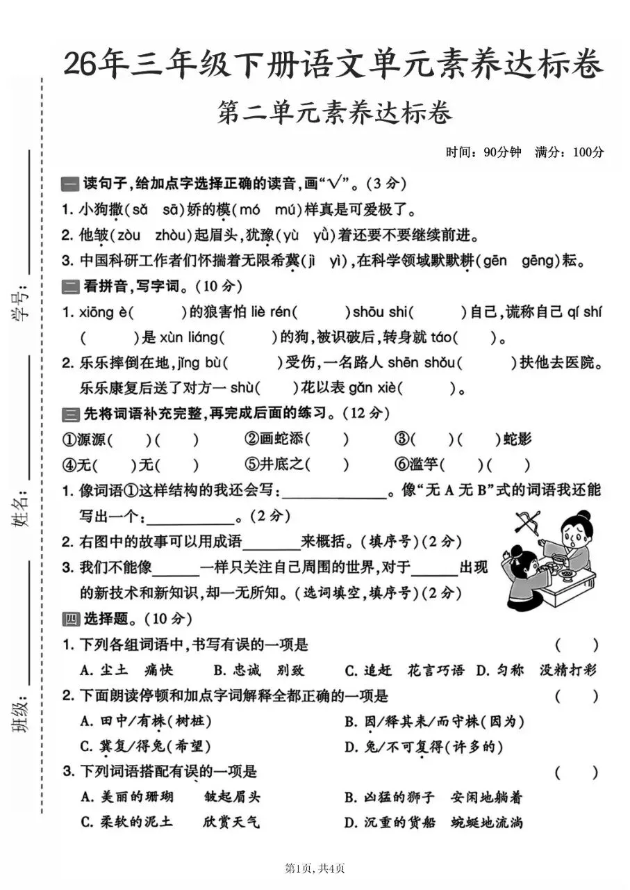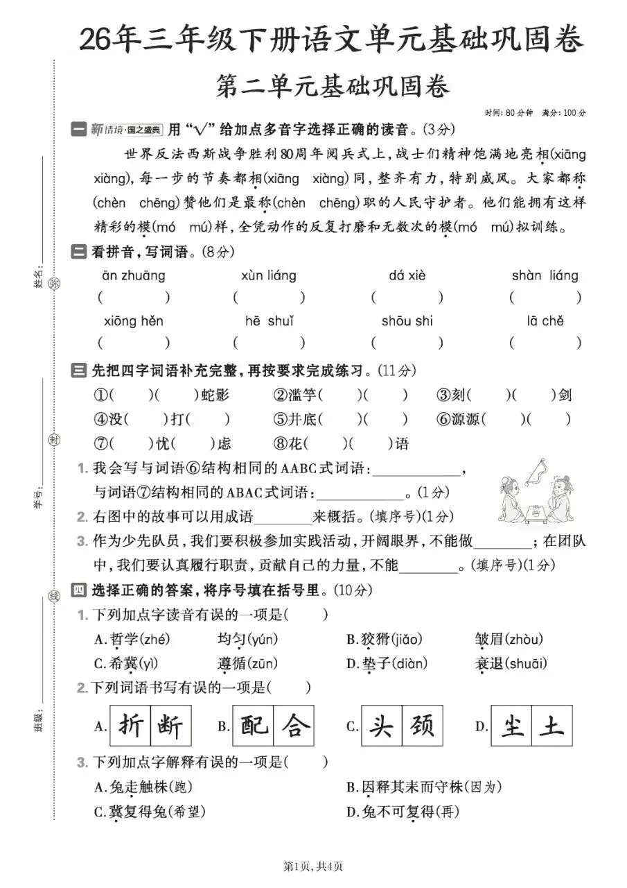 26年新版三年级下册语文《第二单元测试卷》,共6套有答案,电子版可下载可打印,这份三下语文第二单元试卷,题型全面,全方面考验孩子对语文第二单元知识点的掌握情况,帮助孩子及时查漏补缺,巩固提升。有需要的家长抓紧打印出来,让孩子练一练吧!