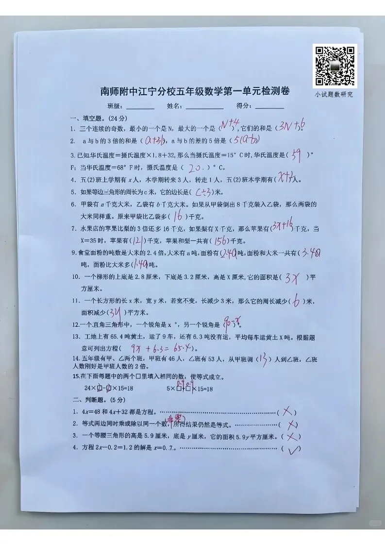 第1000期:南师附中江宁分校五年级数学下册第一单元试卷及答案。
