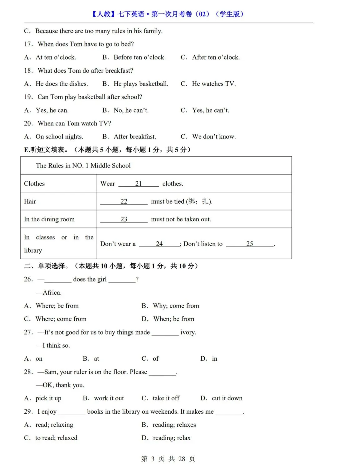 【人教版】七年级下册《英语第一次月考试卷+答案解析》|完整电子版可打印