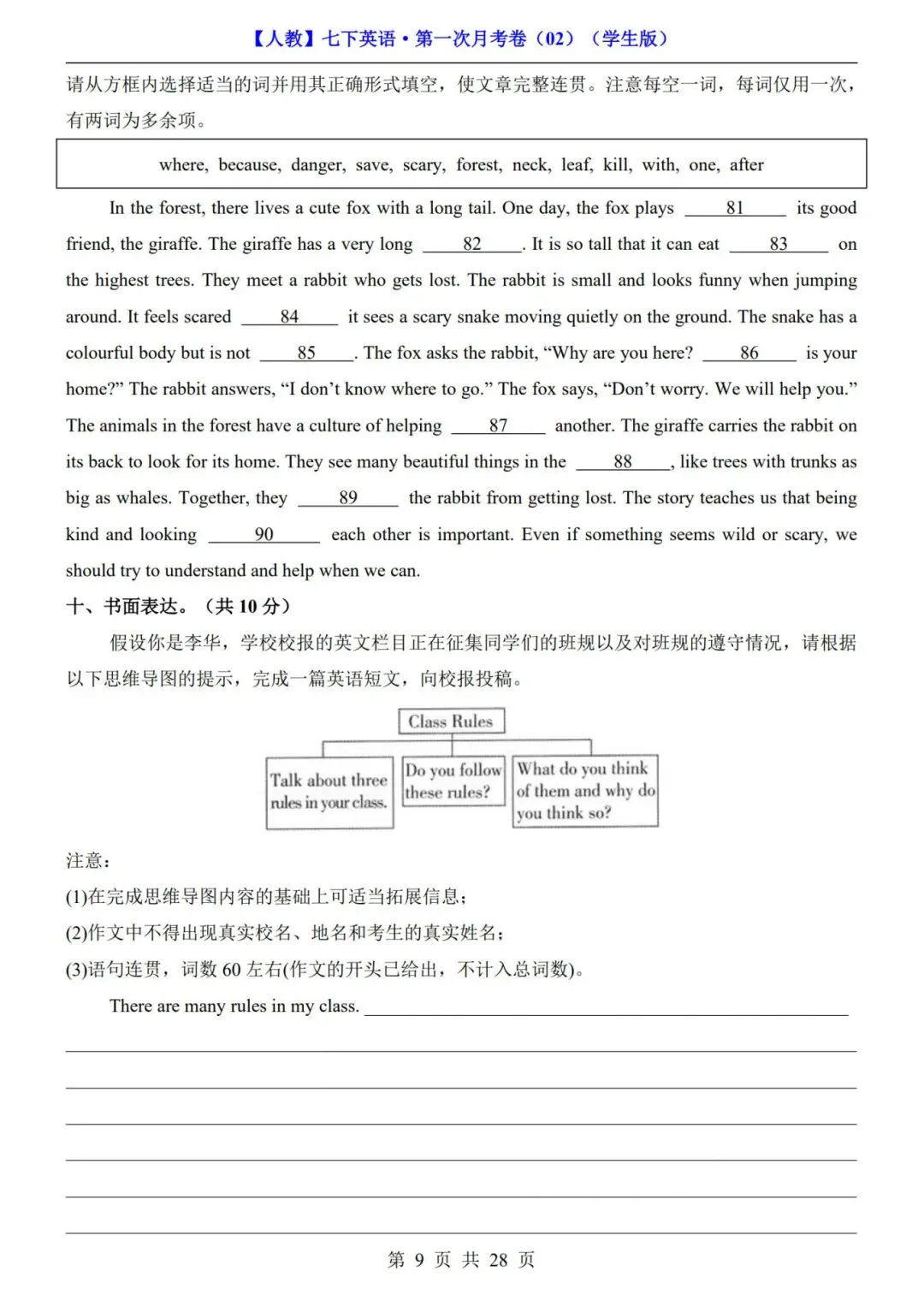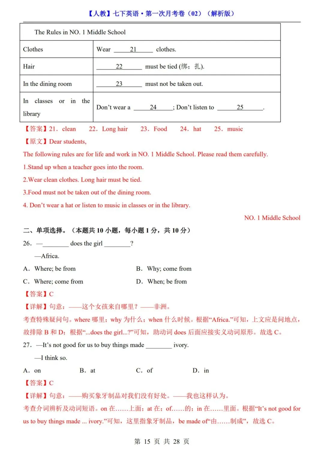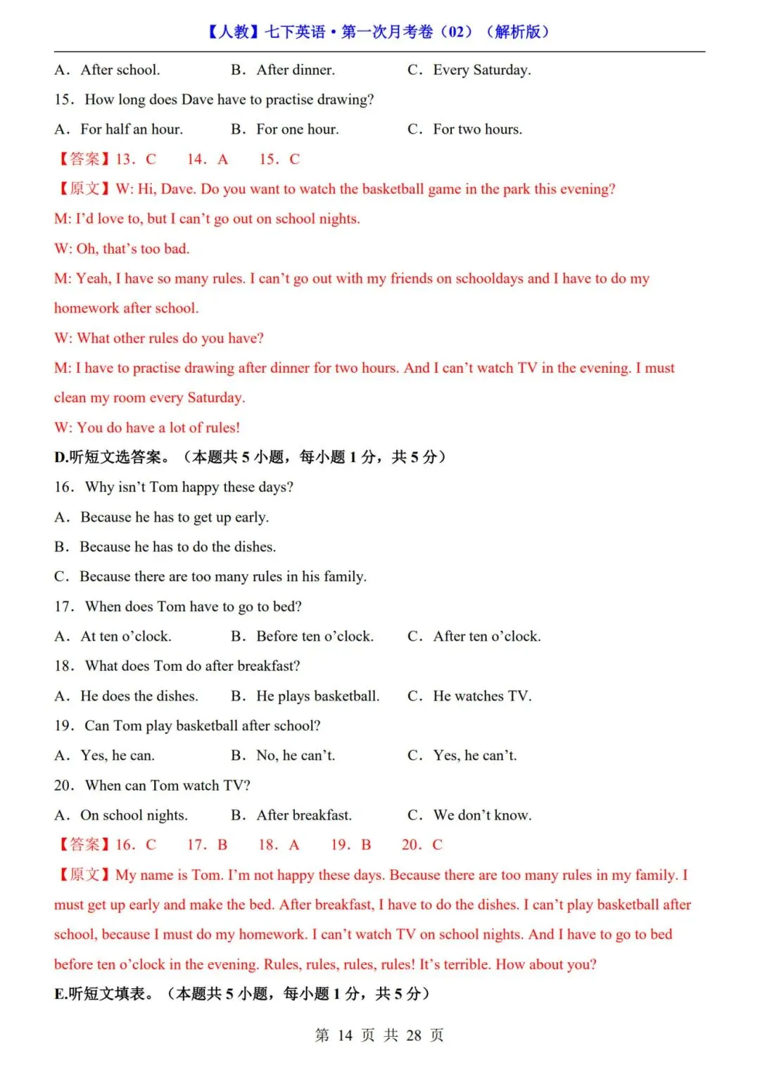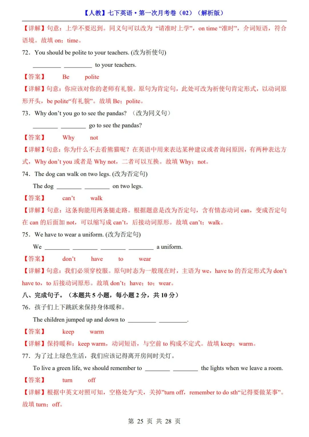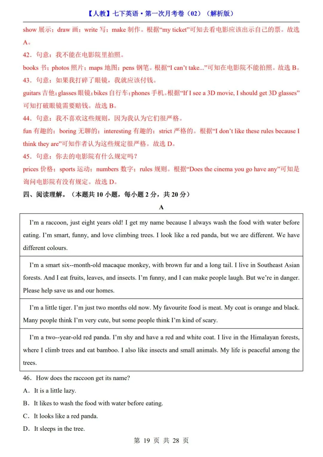 >《人教版》七年级下册英语【第一次月考试卷+答案解析】|电子版可打印