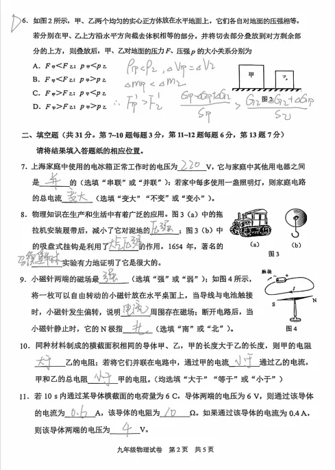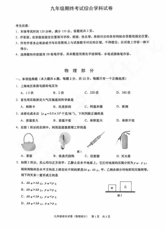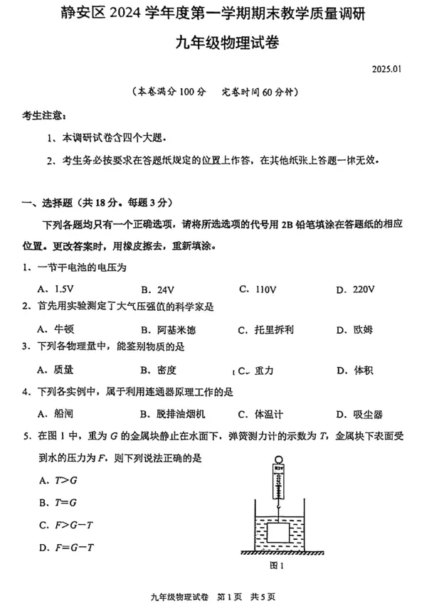 2025届静安区初三一模物理试卷