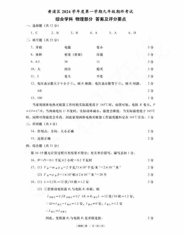 2025届黄浦区初三一模物理试卷