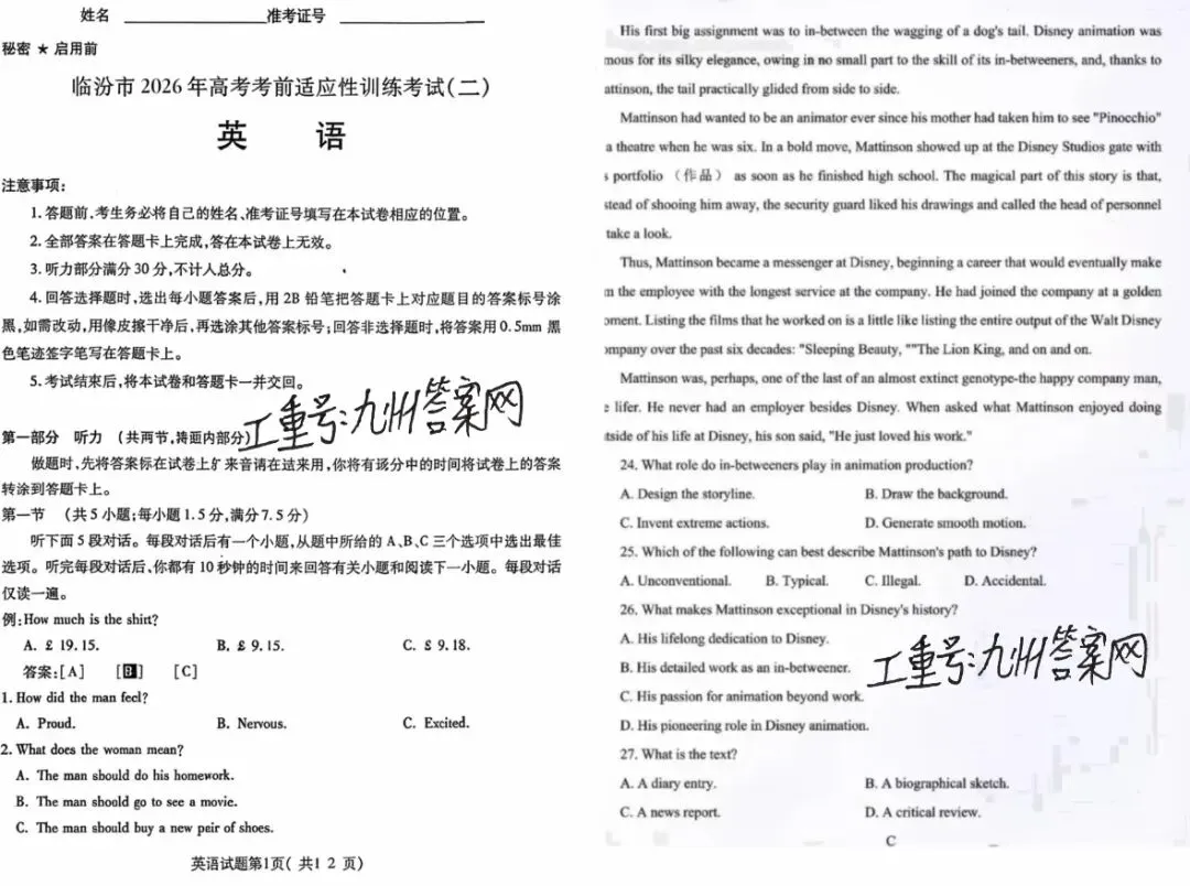 >【试卷+解析】2026年3月临汾二模题卷全科试卷汇总