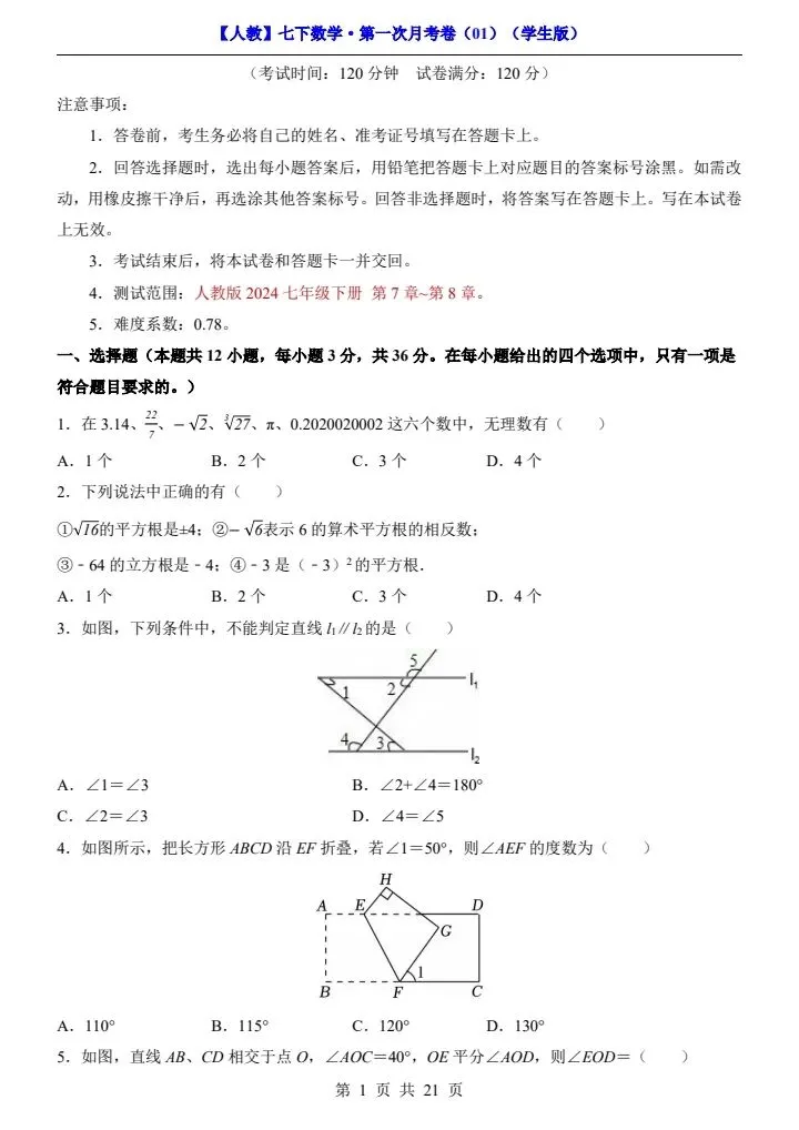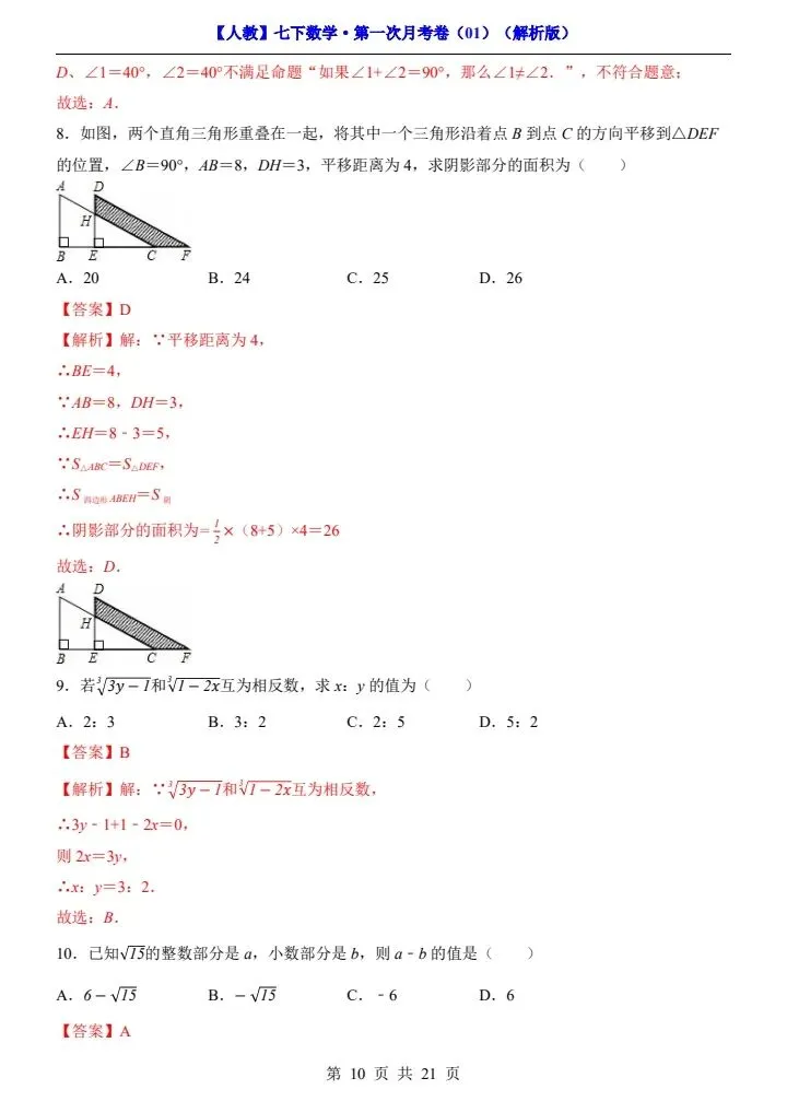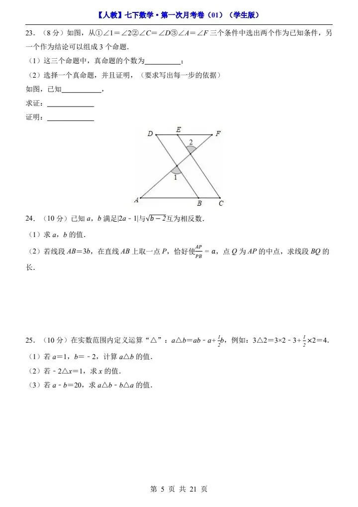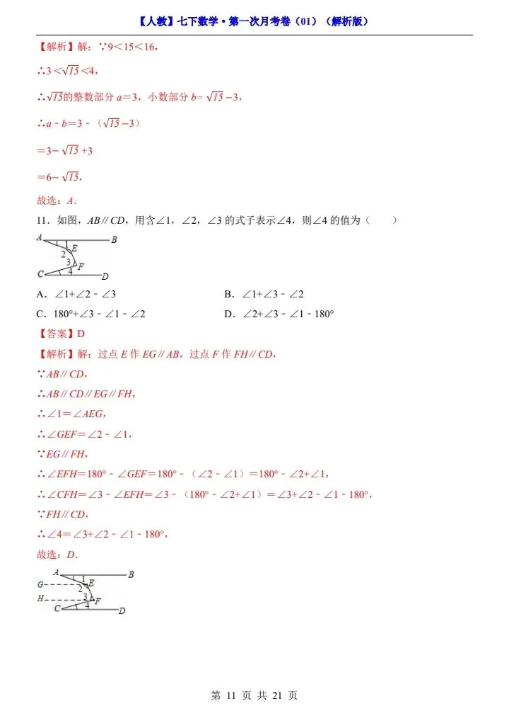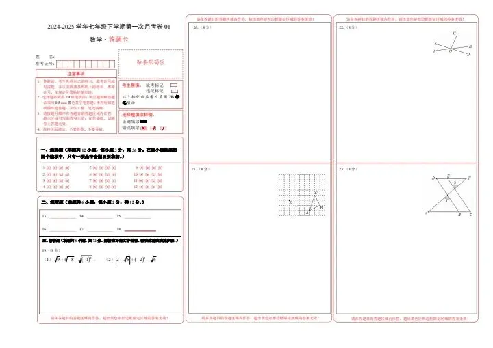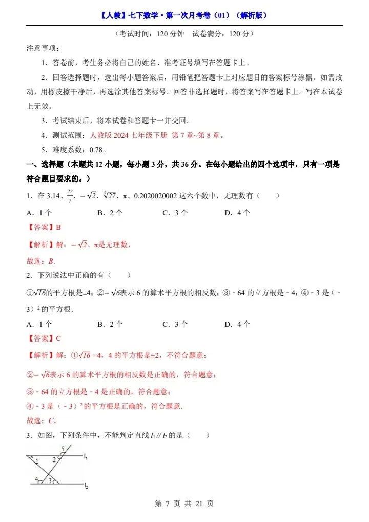 七年级下册数学人教版《第一次月考试卷》第7—8章知识点附答题卡,原卷版+解析版,完整电子版可打印!