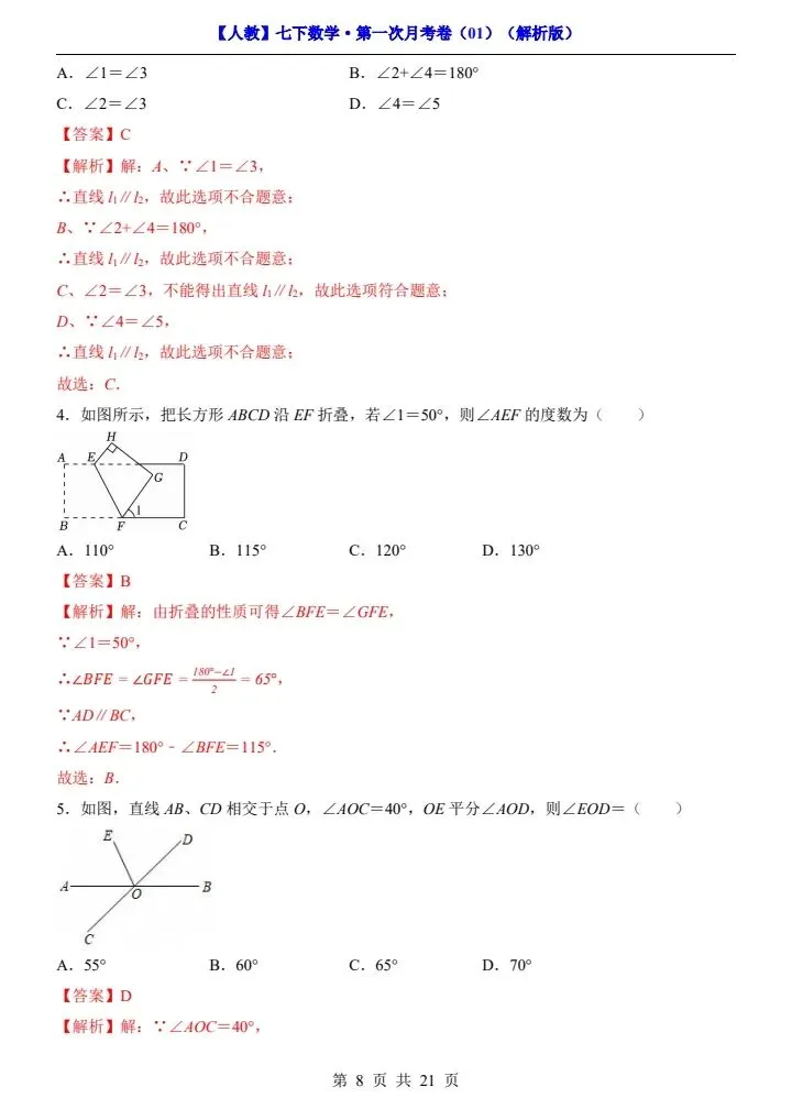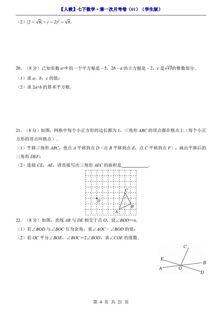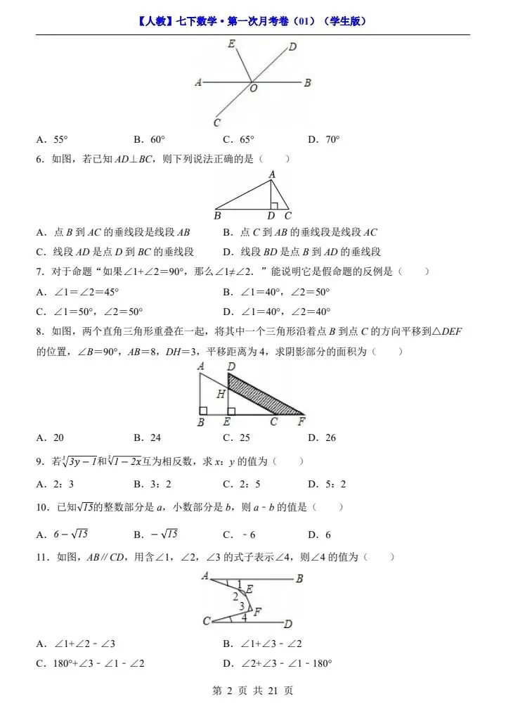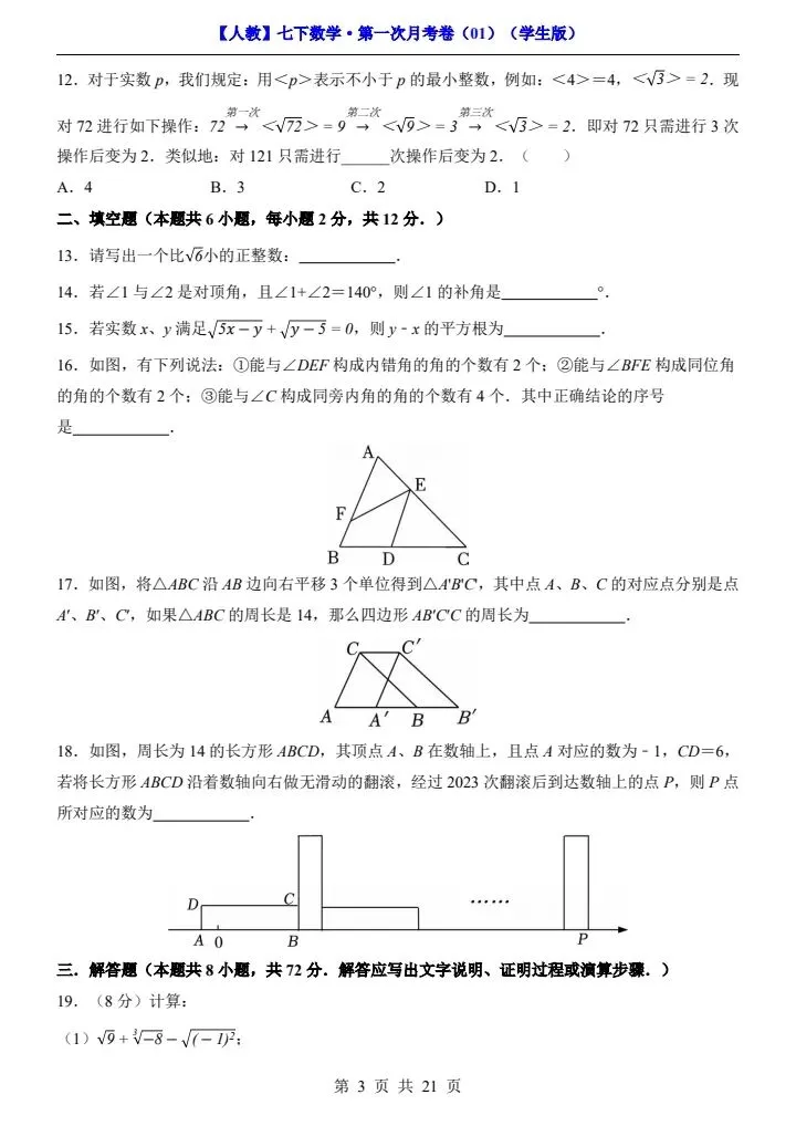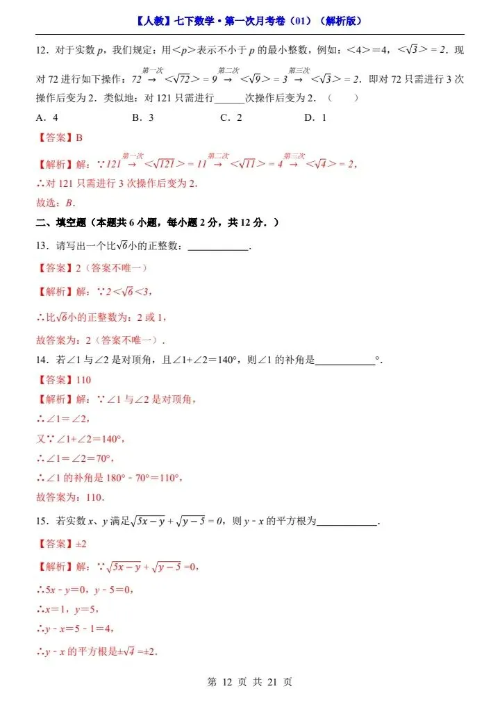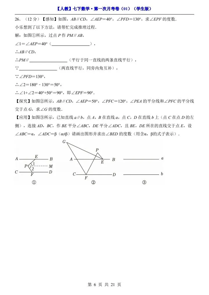 七年级下册数学人教版《第一次月考试卷》第7—8章知识点附答题卡,原卷版+解析版,完整电子版可打印!