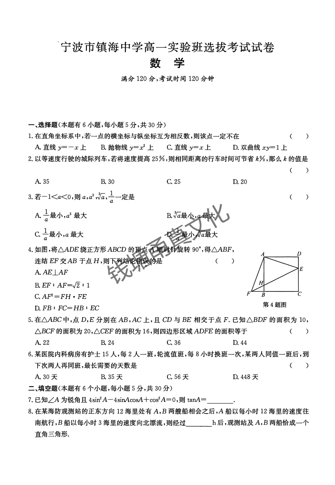 文章中是宁波市镇海中学高一实验班选拔考试数学试卷