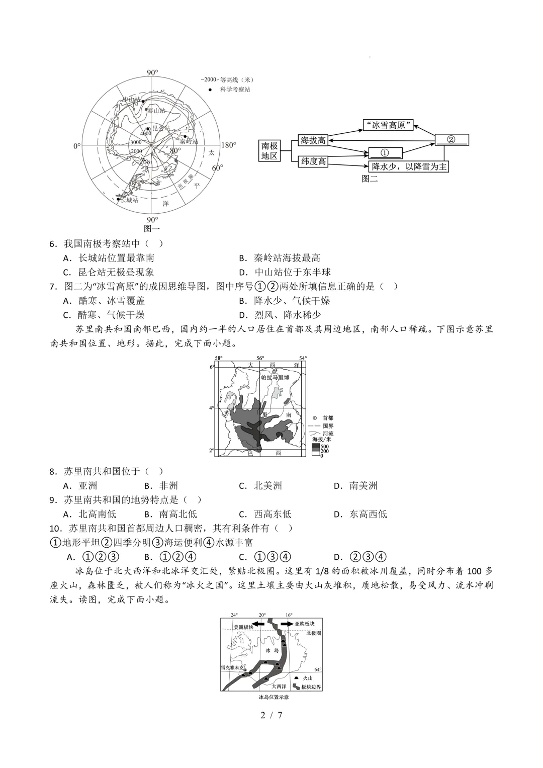 8.D【解析】从材料中可知苏里南共和国南邻巴西,而巴西是南美洲的国家,苏里南共和国也位于南美洲,D正确;亚洲、非洲、北美洲都与巴西不相邻,所以苏里南共和国不可能位于这三个大洲,ABC错误。故选D。