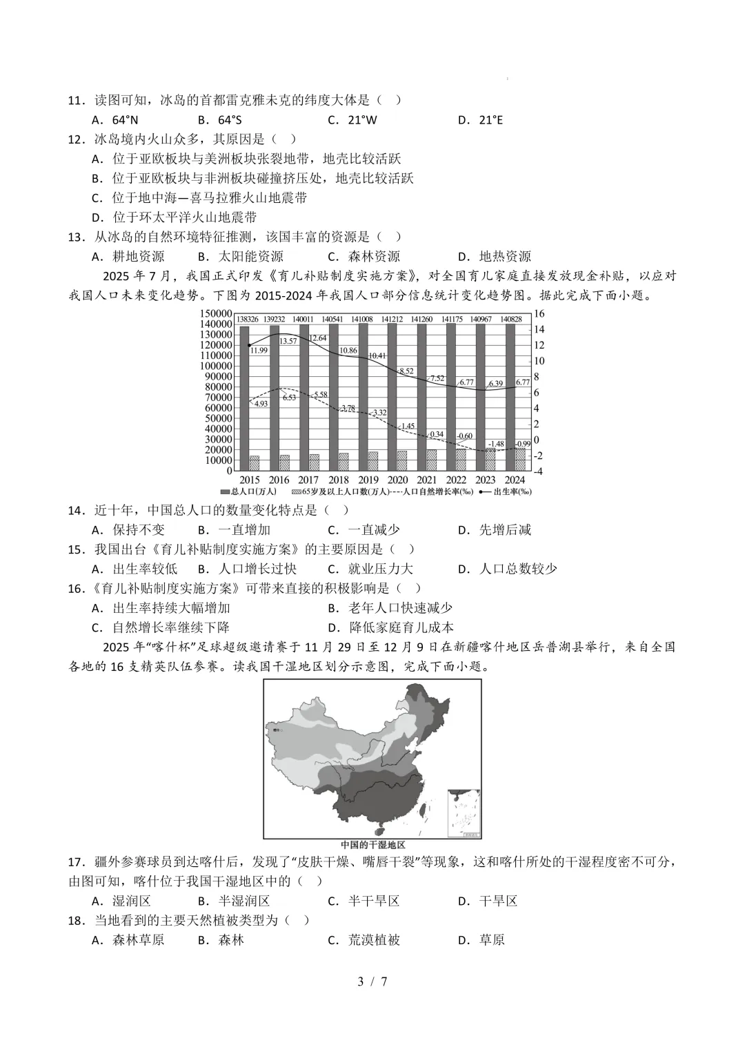 15.A【解析】 从图中“出生率(‰)”曲线可知,我国2015-2024年出生率从11.99‰持续降至5.77‰,近年出生率持续走低,而《育儿补贴制度实施方案》的核心是通过现金补贴降低育儿成本、鼓励生育,因此该政策出台的主要原因是出生率较低,A正确;当前我国总人口增长放缓、后期甚至减少,人口增长并非“过快”,若人口增长过快、压力较大,反而不需要通过补贴鼓励生育,B错误;若就业压力大,鼓励生育出生率提升会增加未来劳动力供给,短期可能加剧就业压力,因此“就业压力大”并非该政策的原因,C错误,我国总人口超14亿,并非“人口总数较少”,与实际情况矛盾,D错误。故选A。