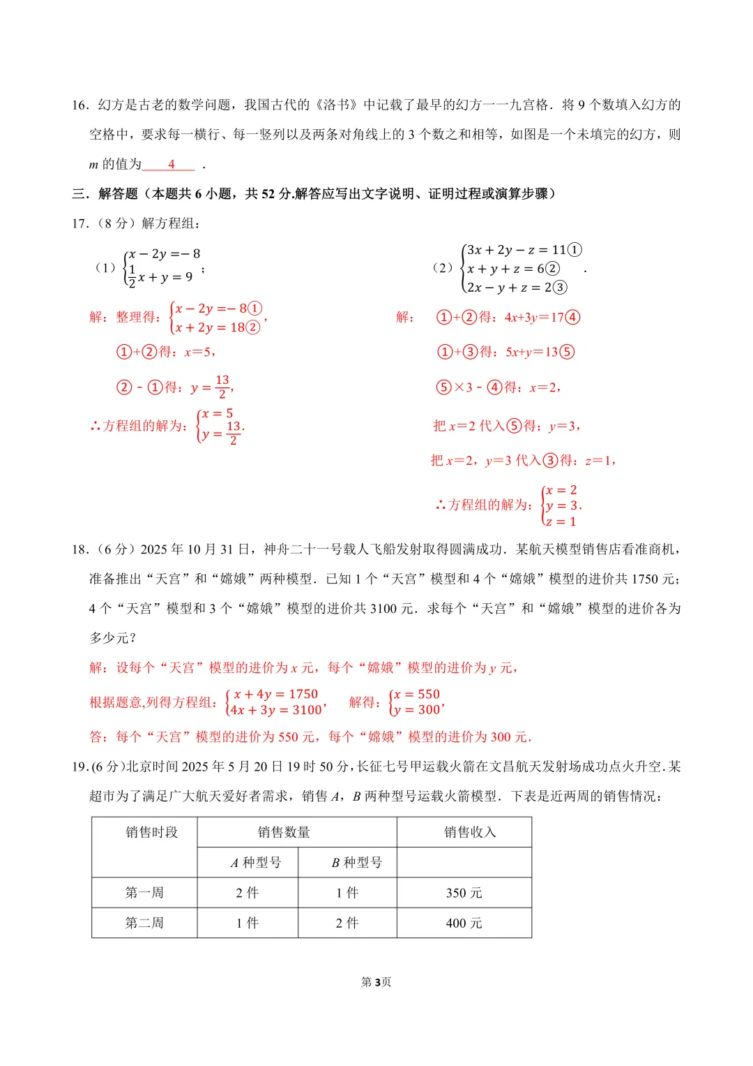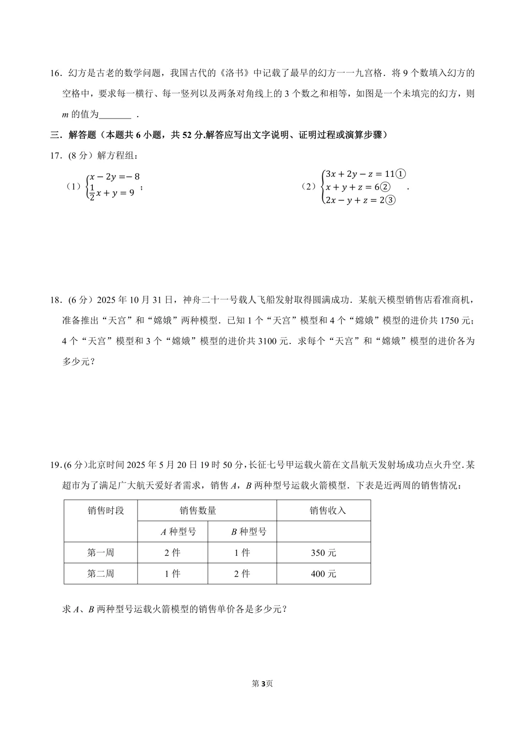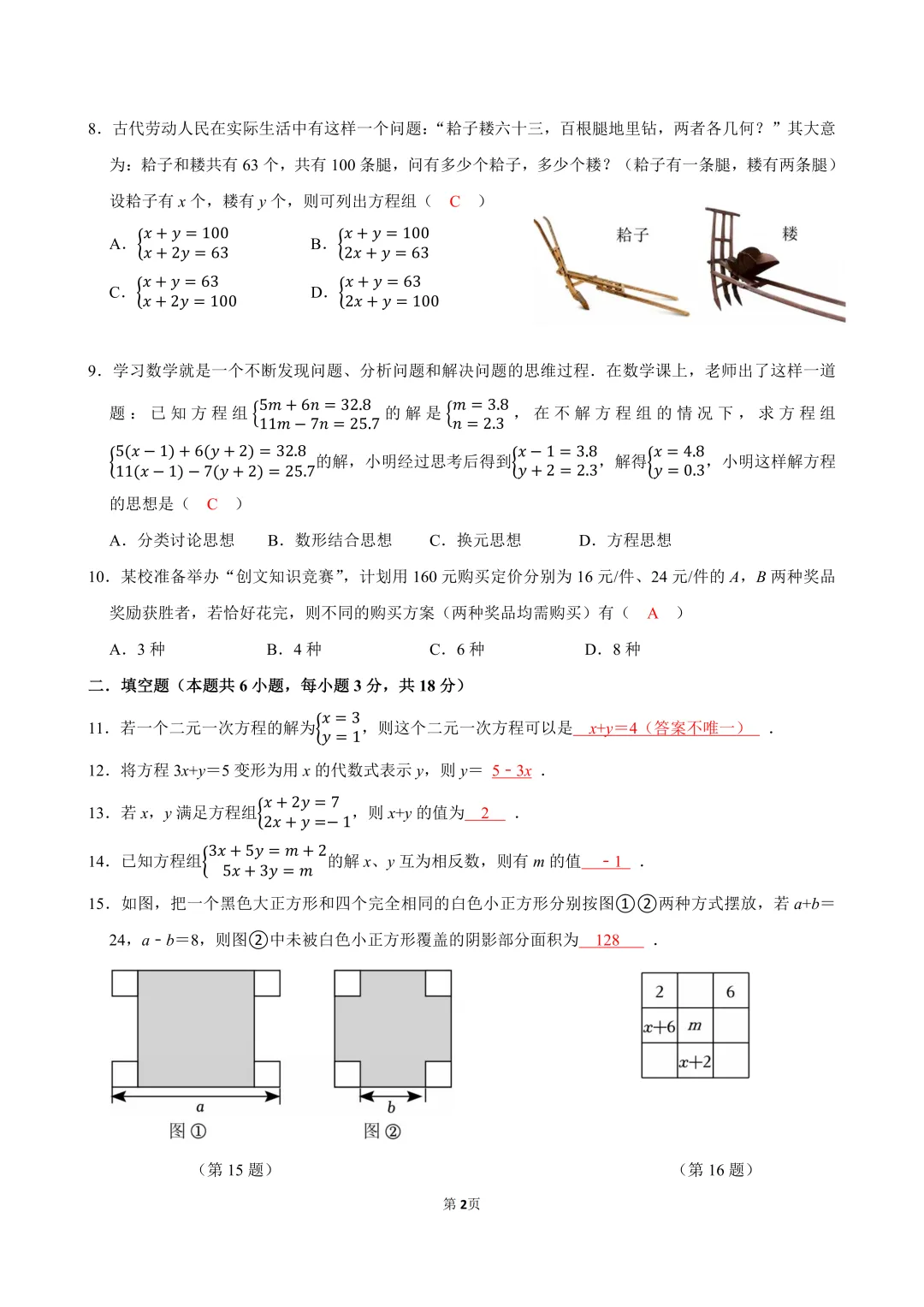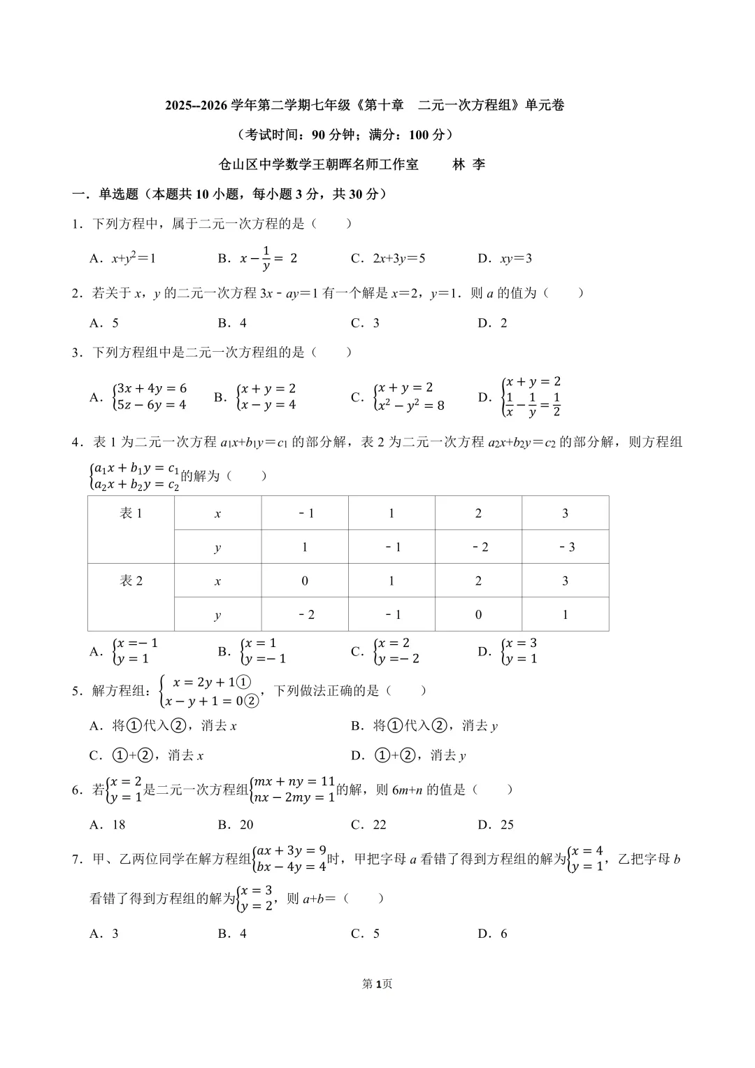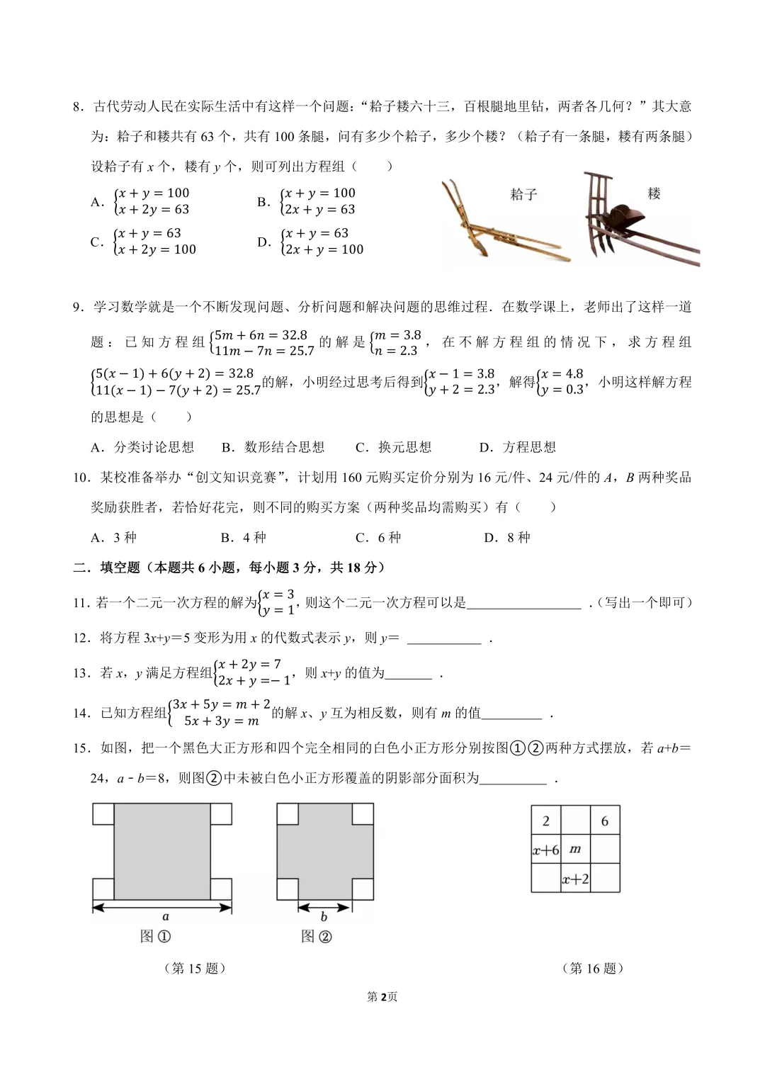 人教版,2025-2026学年第二学期七年级第十章《二元一次方程组》单元试卷。
