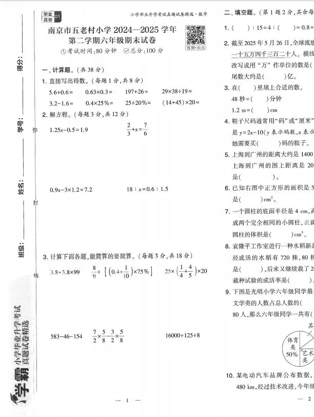 2026春《学霸小学毕业升学考试真题试卷精选34套》,小升初数学江苏专用,电子版pdf可打印(文末附获取方式)包含答案