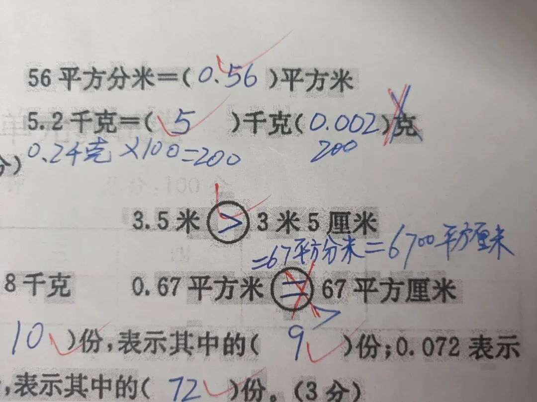 孙女恍然大悟,赶紧改掉等号,还不忘叮嘱自己:换单位先理清进率,不能只看数字!