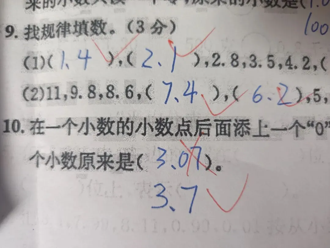 讲到添0扩倍的题,孙女算出3.07却忘了“原数”。我提醒她:“添个0就是扩大10倍,原数要缩小回去,3.07÷10=0.307!”
