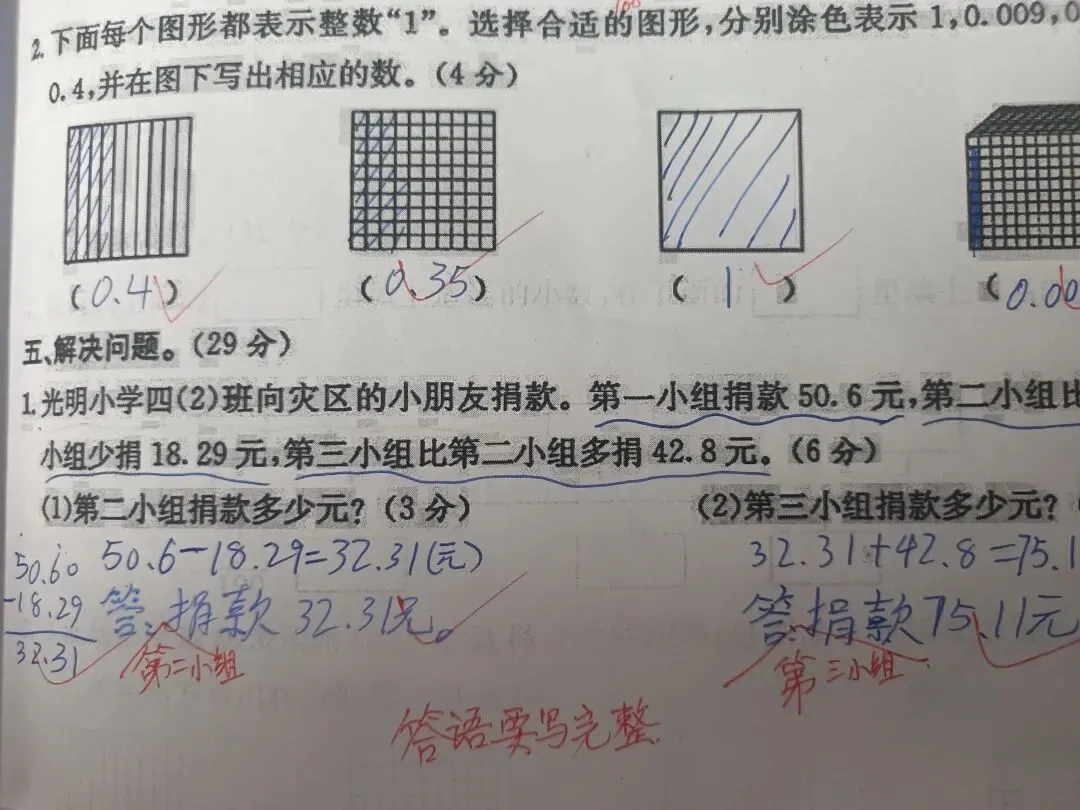 我提醒孙女:“答语要完整,比如‘第二小组捐款32.31元’,要带单位,说清楚谁捐款多少!”她赶紧补全了答语。