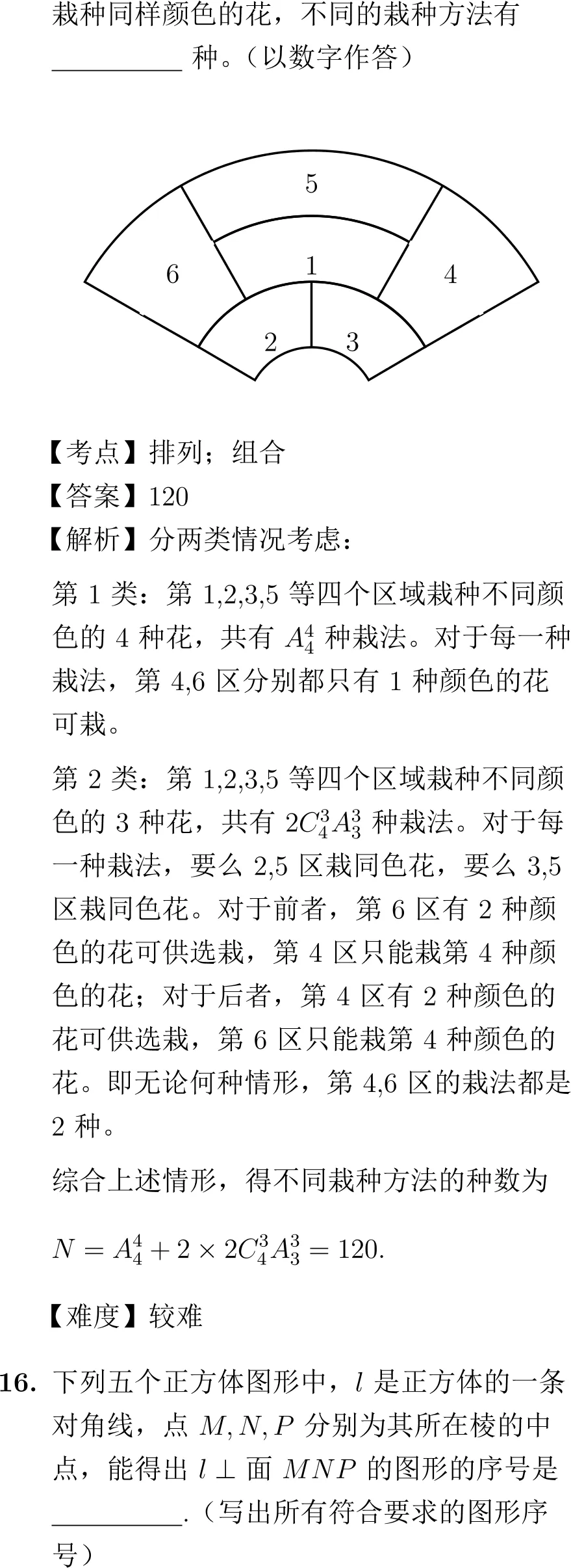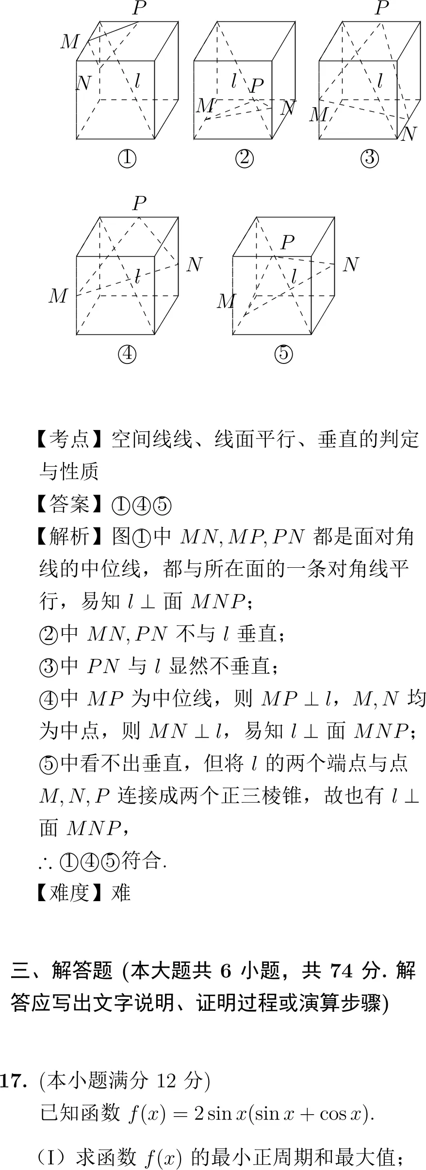 试卷由选择题、填空题和解答题三部分组成,满分150分。内容覆盖代数、几何、概率统计、微积分初步等主干模块。选择题侧重考查基本概念与运算技巧,如复数运算、三角函数求值及分段函数不等式,题目设计灵活,要求考生具备快速反应能力。填空题则增加了空间想象与排列组合的难度,特别是染色问题与正方体线面关系判定,有效区分了学生的逻辑思维层次。解答题作为重头戏,涵盖了三角函数图像、立体几何计算、导数应用、概率分布、解析几何轨迹及数列综合,全面考察了考生的推理论证与运算求解能力。