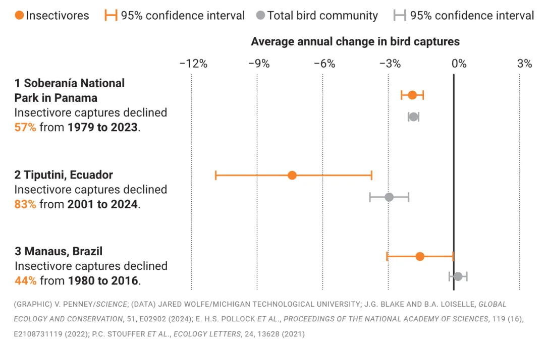 几十年的长期监测证实了这些令人担忧的印象。在厄瓜多尔的亚苏尼生物圈保护区,系统调查显示,在 2001 年至 2014 年间,鸟类数量下降了 50%。情况最糟的物种是食虫鸟类——那些在森林地表潜行觅食的鸟类。在巴西的森林碎片生物学动态项目中也出现了类似的趋势,那里的鸟类体重明显低于 20 世纪 80 年代,表明存在严重的营养不足。在巴拿马,70% 的常驻物种数量有所减少,这种损失全面波及了杂食性鸟类和食果鸟类。