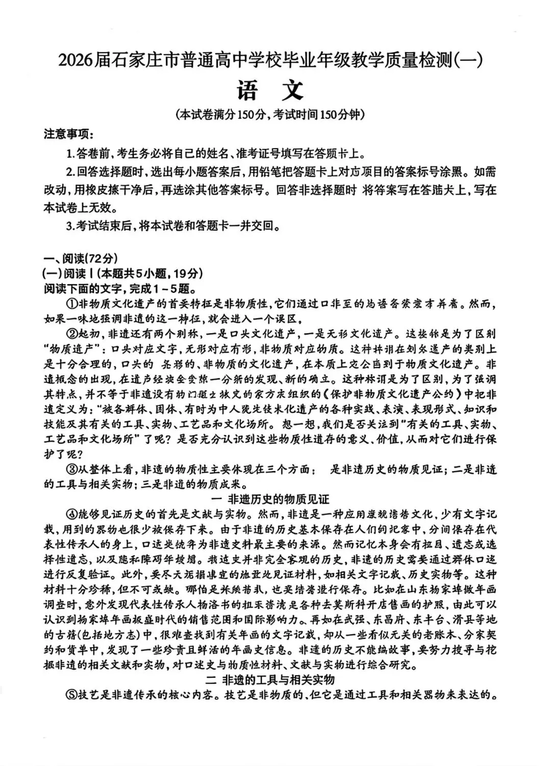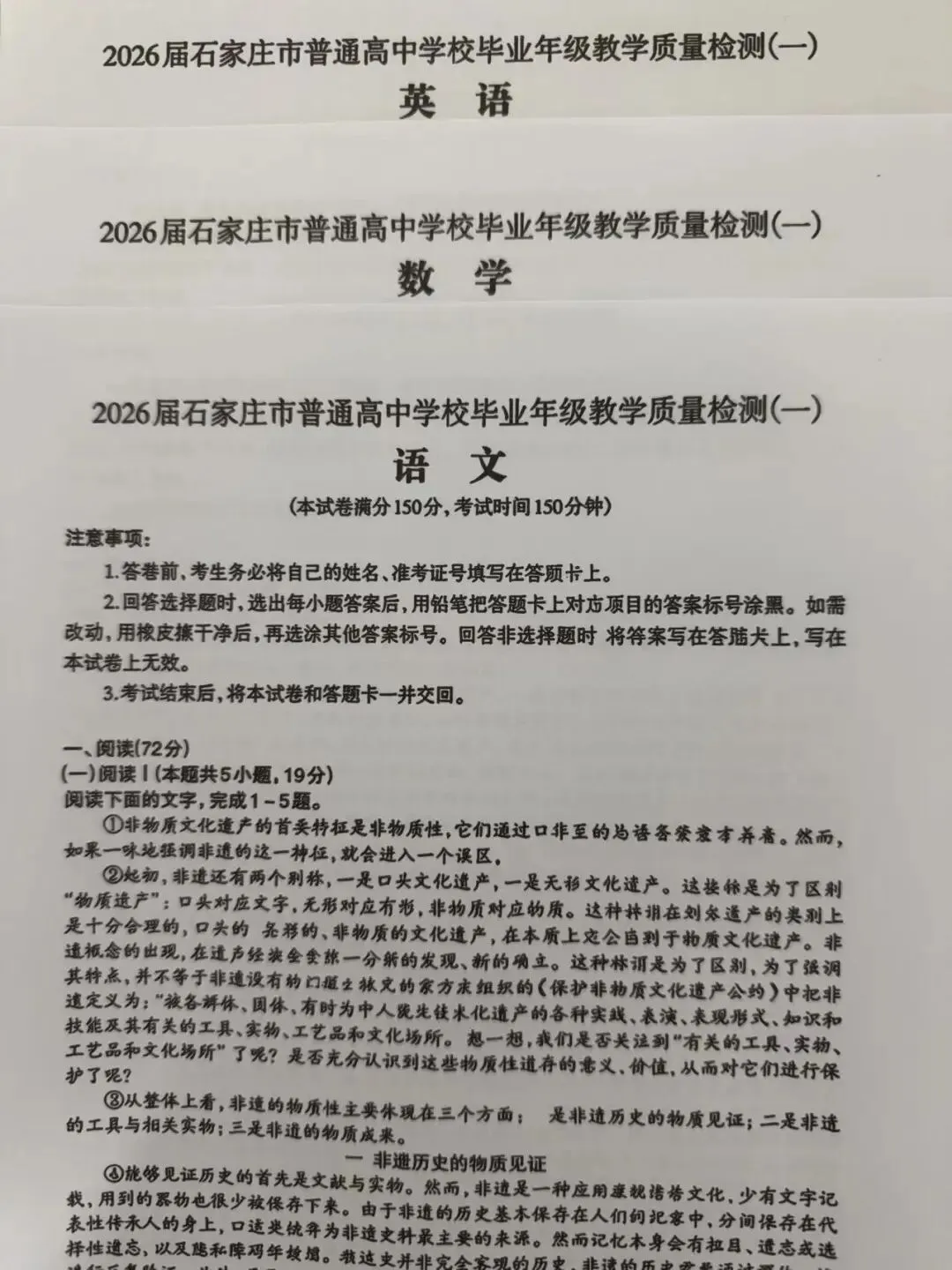 考试名称:石家庄一模石家庄市2026届普通高中学校毕业年级教学质量检测(一)