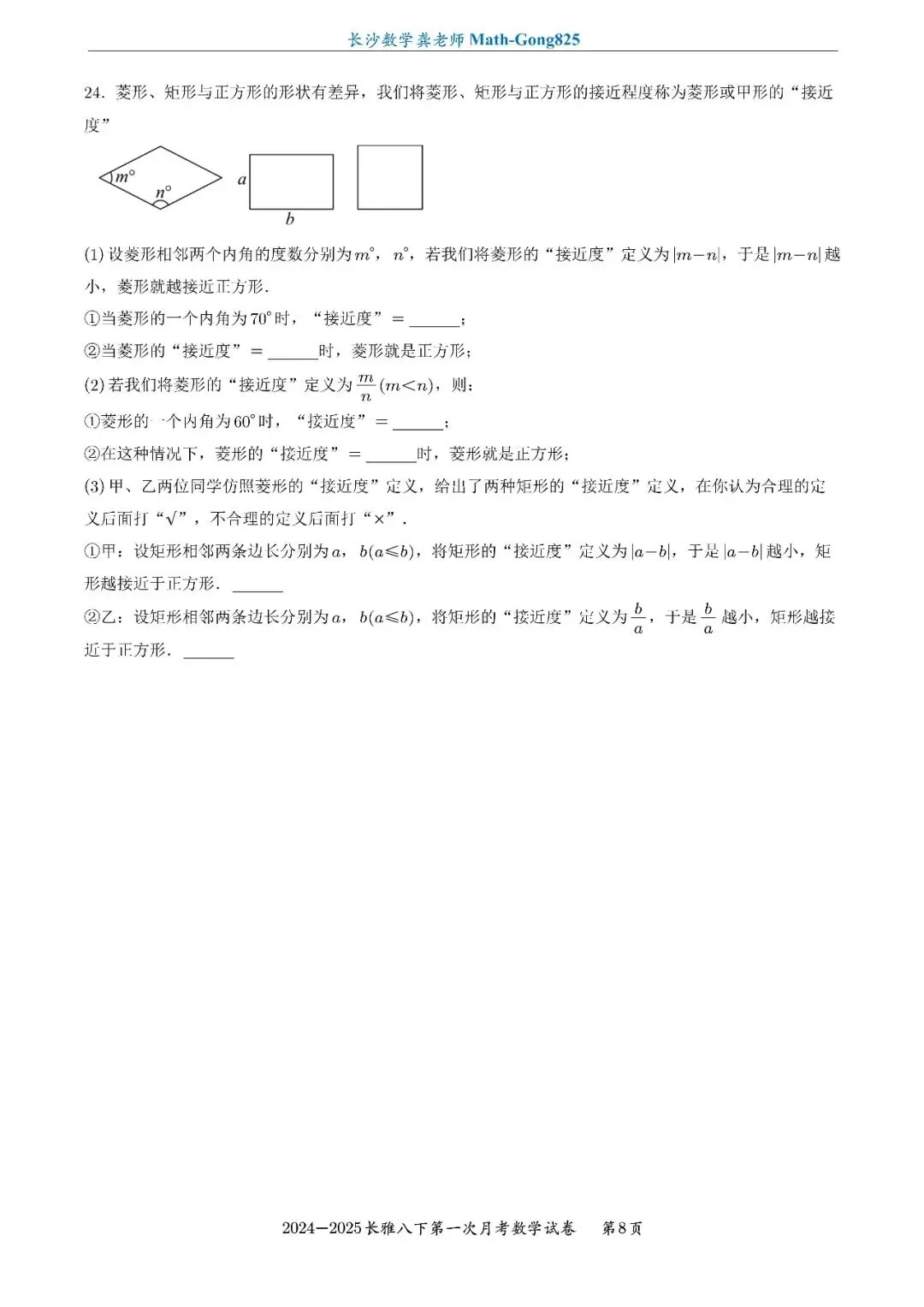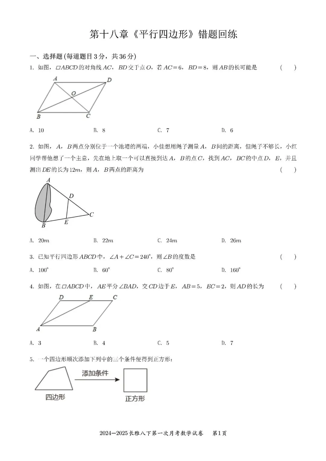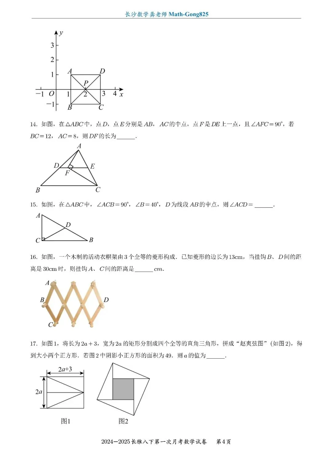 25年春季长雅中学八下第一次月考数学试卷-原卷