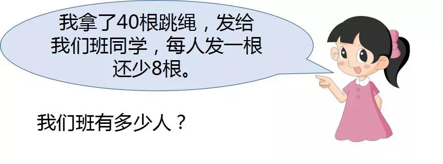 【分析:首先读题时要仔细,不能出现漏字或添字的现象,避免对题目的理解出错。然后要理解题目中“40根跳绳,每人分一根还少8根”的含义,这说明班里的人数比跳绳的数量多8,所以在求班里总人数时,应该用加法计算。】